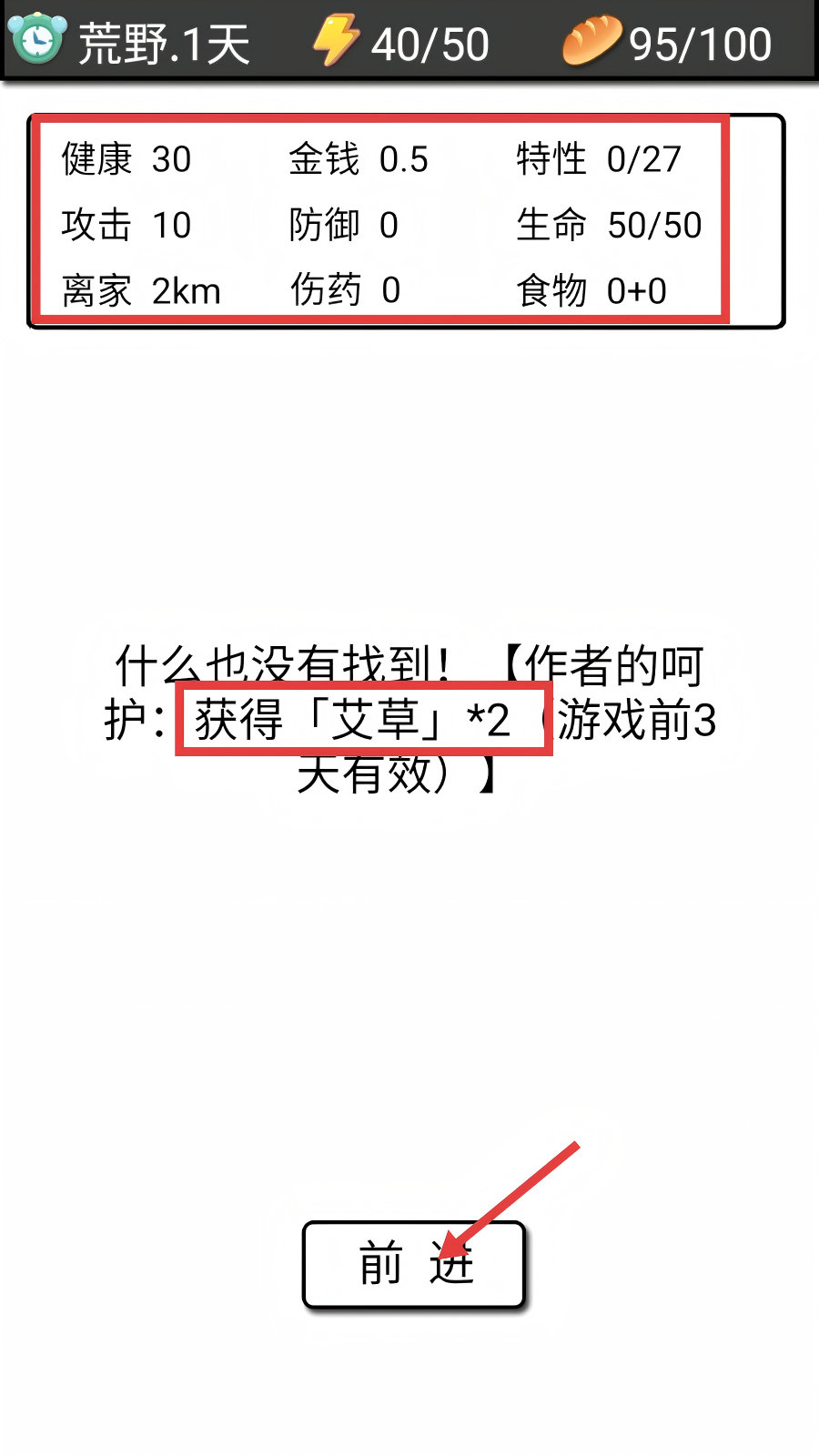 2、探索荒野时,关注健康、金钱等属性,获得【艾草】*2后,点击【前进】继续推进探索进程。