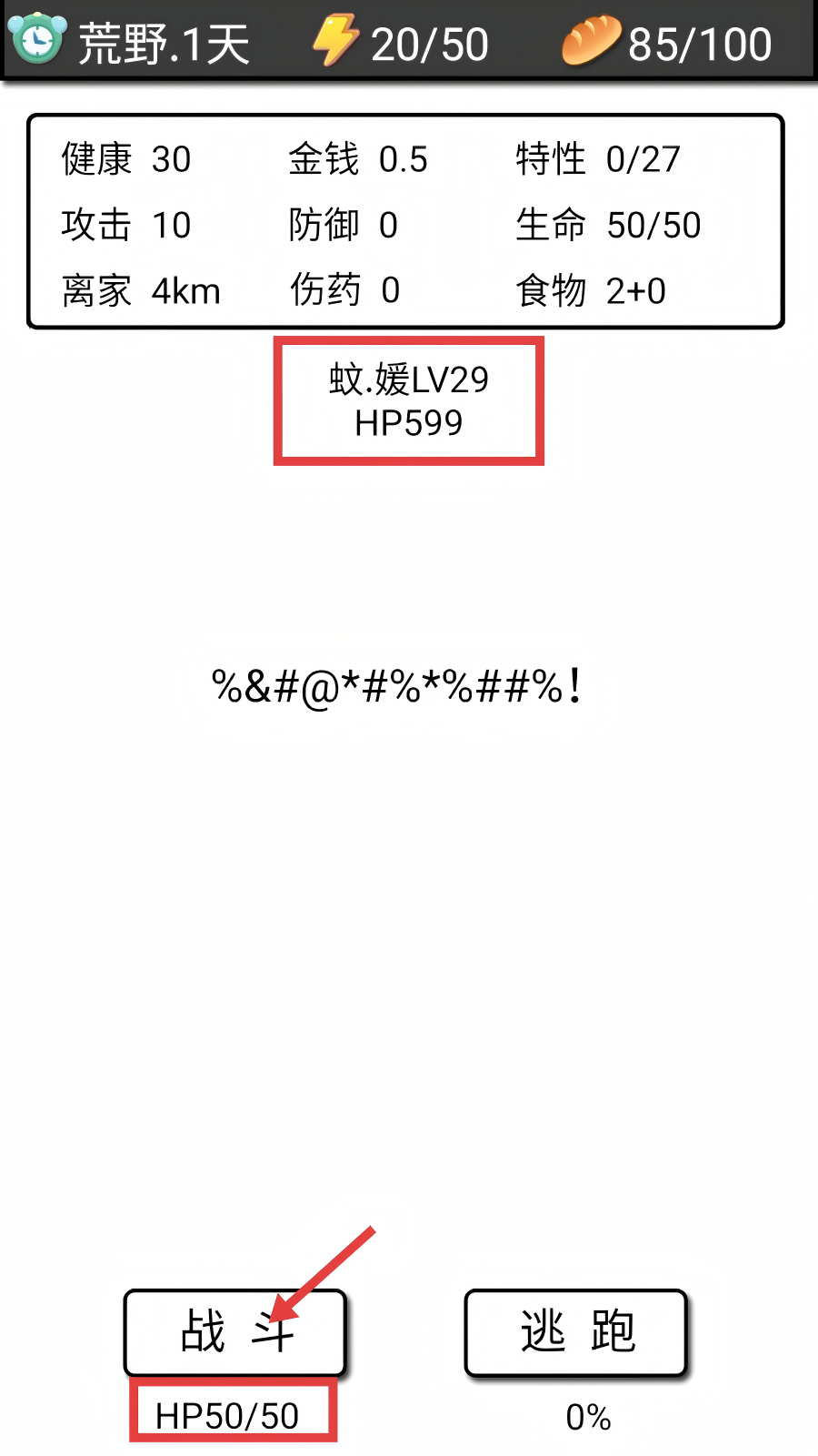 3、遭遇“蚊.媛LV29”这类怪物,若自身生命(HP50/50)充足,点击【战斗】选项发起攻击。