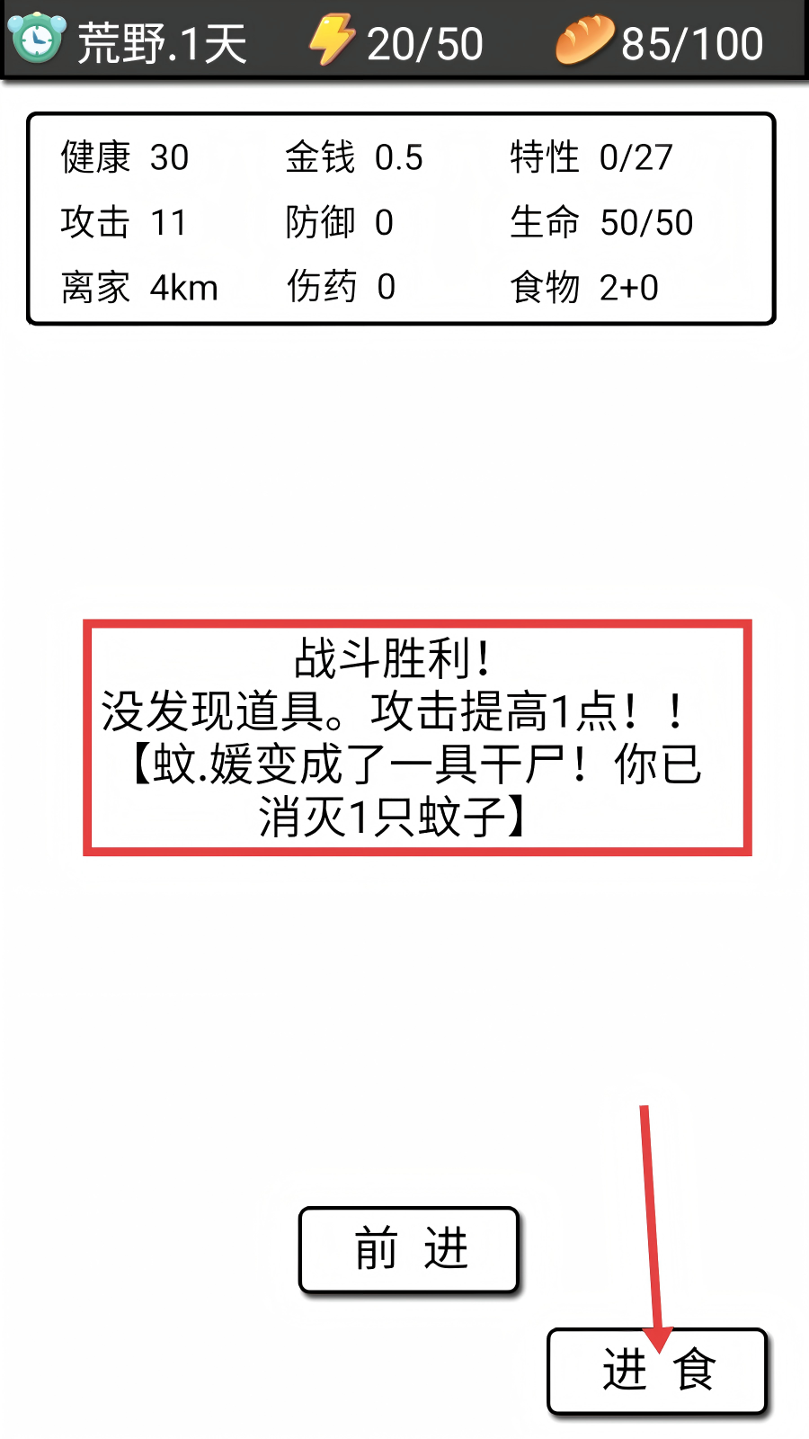 4、战斗胜利后攻击提升1点,此时点击【进食】恢复状态,为后续探索或战斗做好准备。