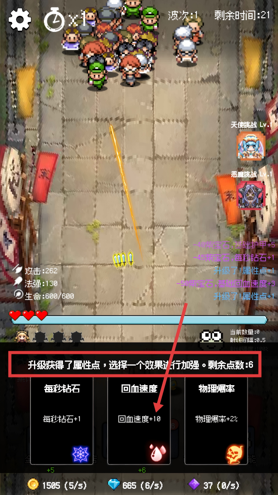 3、升级获得属性点后,可从“每秒钻石”“回血速度”“物理爆率”中选效果加强,提升生存或资源获取。