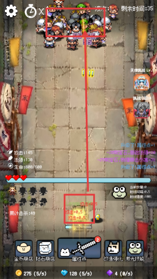 2、战斗时,激光自动攻击上方敌人,击杀敌人可获得“攻击+0.5”等属性提升,强化自身战力。