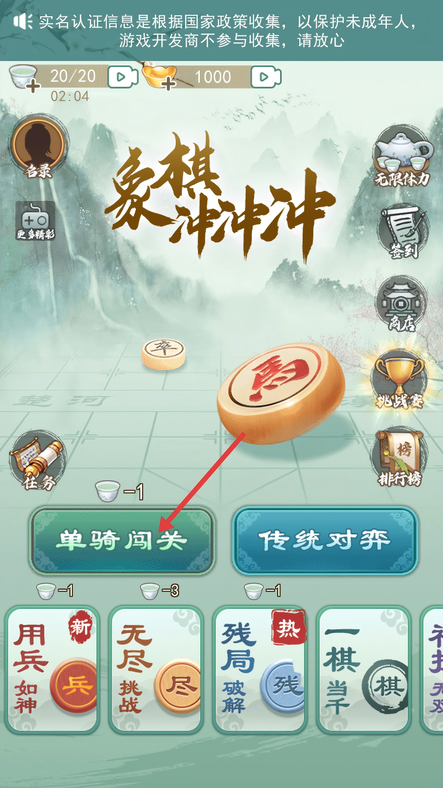 1、进入游戏后,点击【单骑闯关】按钮(消耗1点体力),开启关卡挑战。