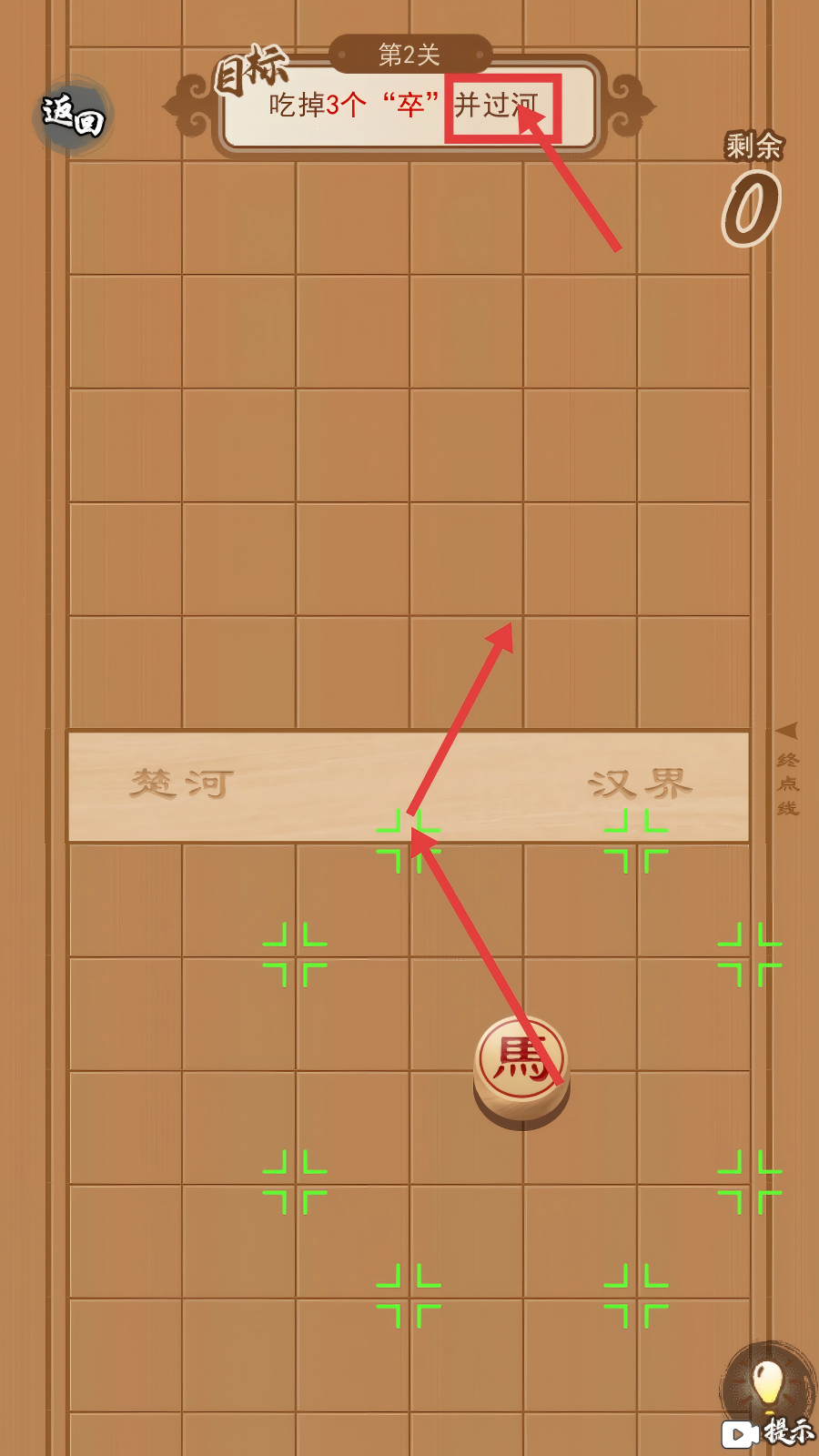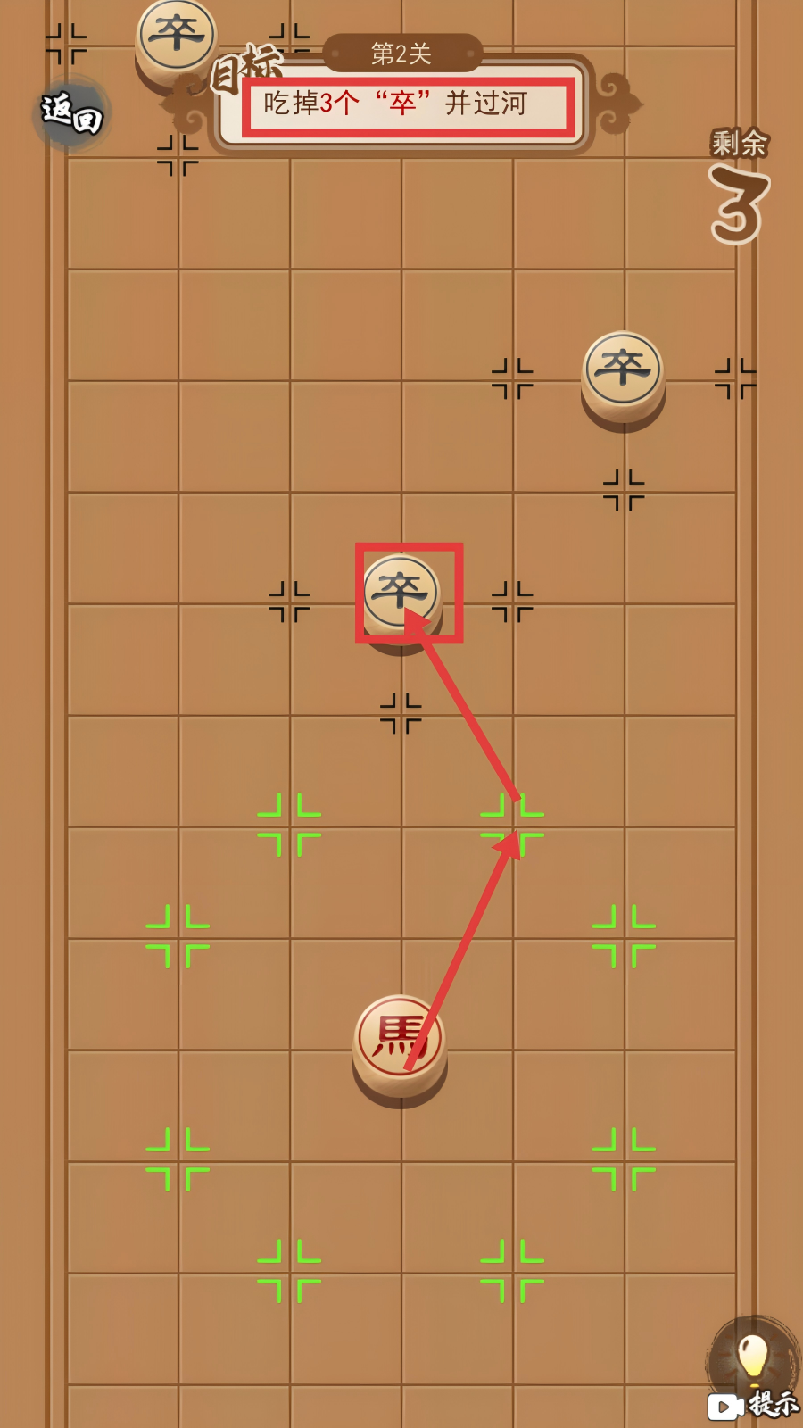 2、第2关要求“吃掉3个‘卒’并过河”。操控“马”按象棋“日”字走法,先瞄准中间的“卒”进攻并吃掉。