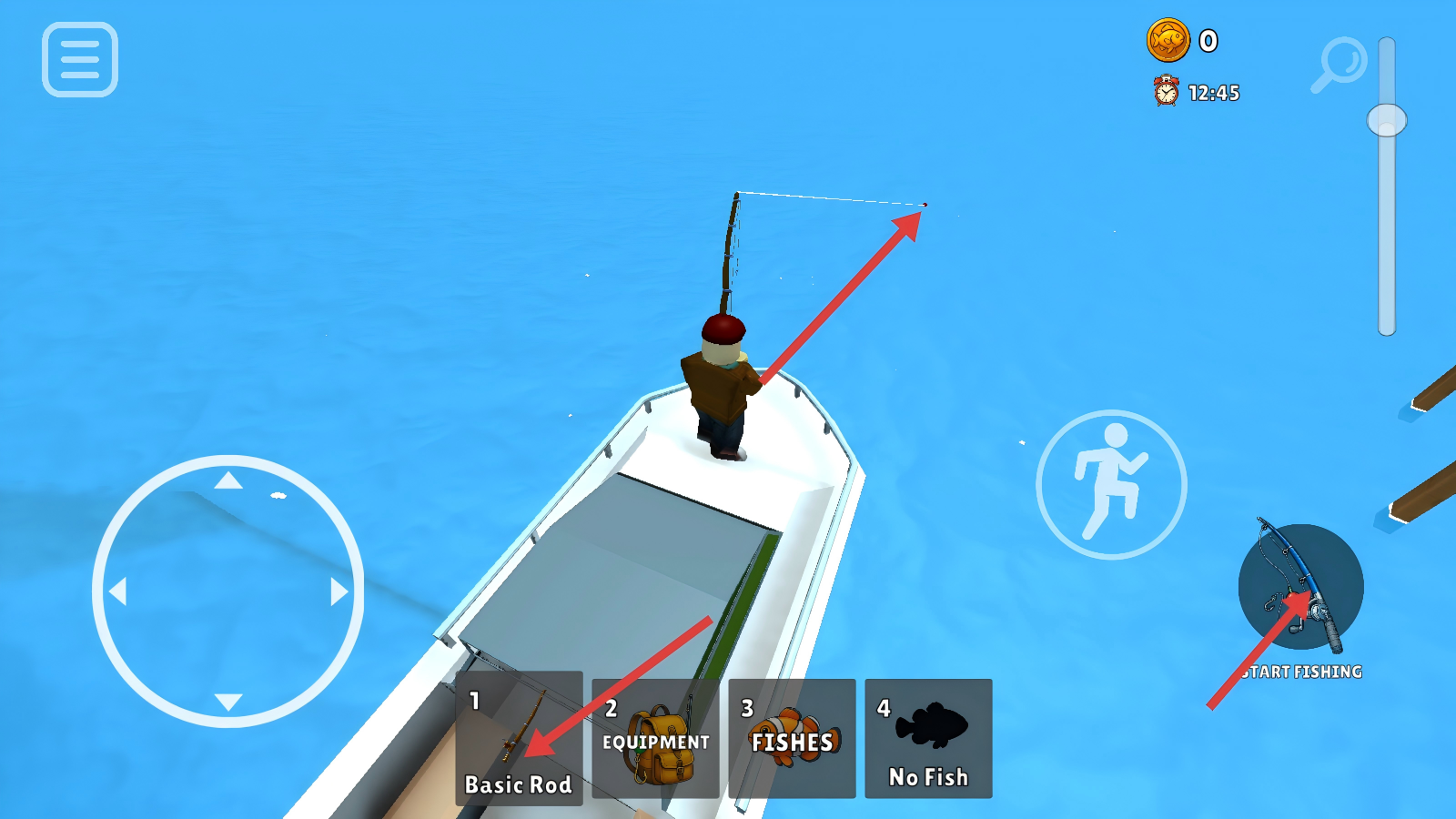 1、用左侧摇杆控制角色移动,点击右侧跑步图标可加速,记得查看下方【Basic-Rod】等初始道具。