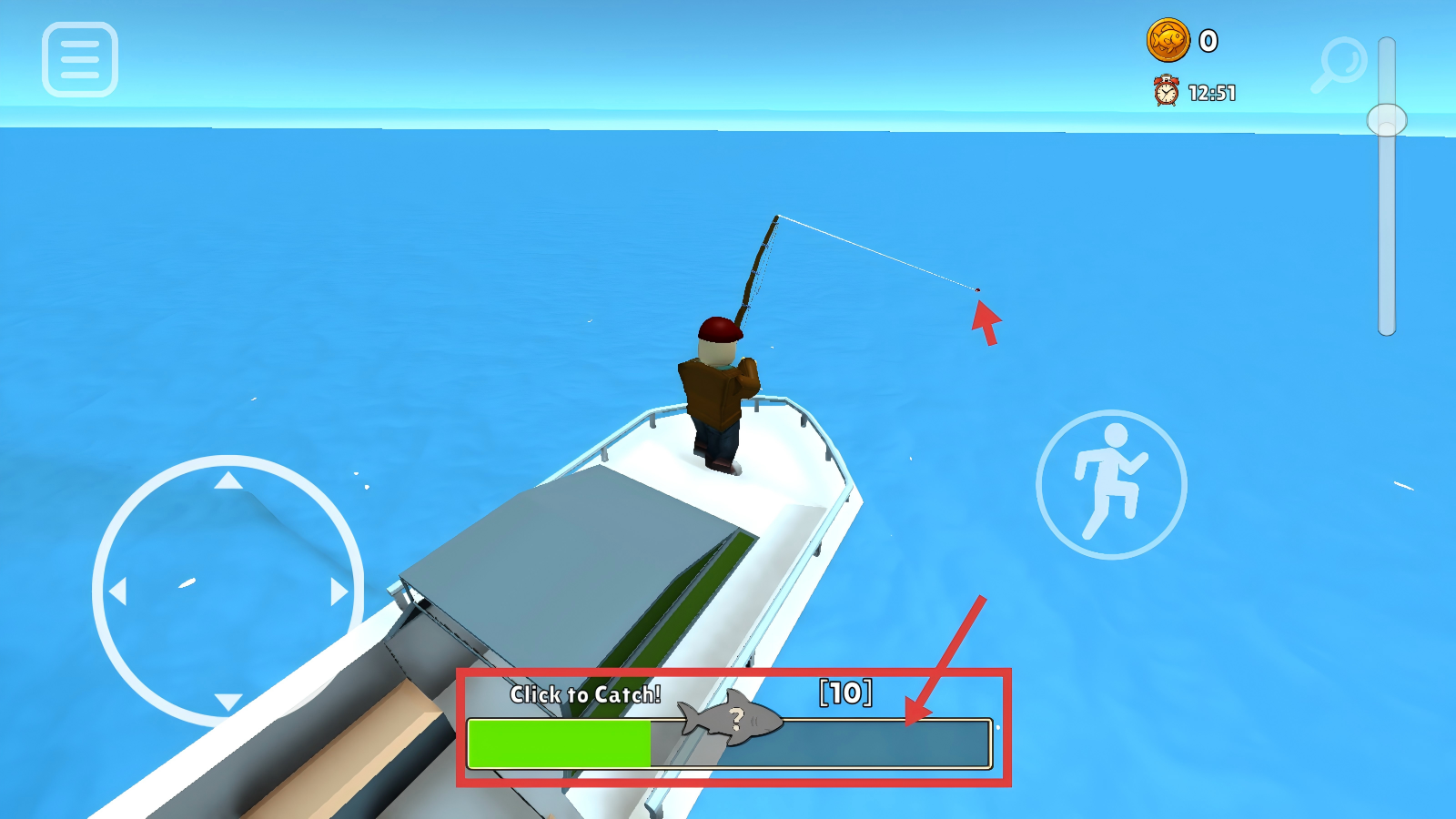 3、当鱼竿有动静时,留意下方【Click-to-Catch!】进度条,及时点击来推进抓鱼进度。