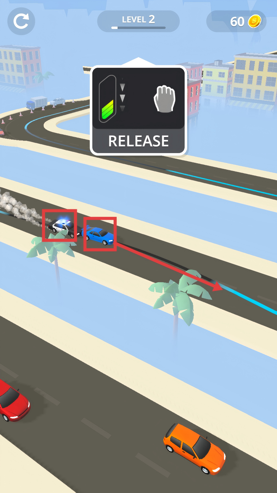 2、赛车时,出现【RELEASE】提示时,把握时机释放车辆,注意避开警车等障碍,沿着路线前进。