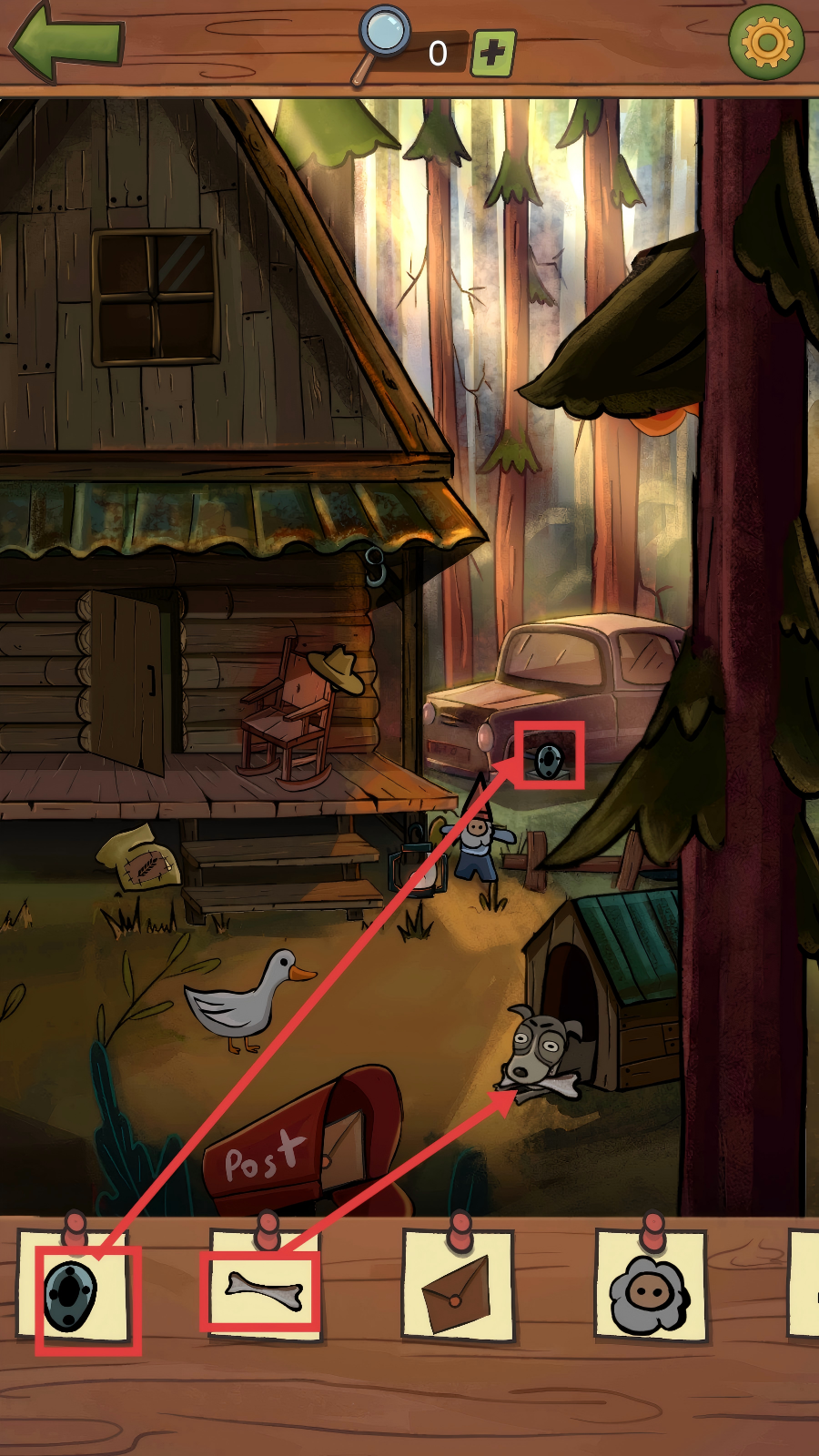 2、来到木屋场景,仔细观察画面,找到与下方道具栏匹配的【车轮】和【骨头】,点击收集它们。