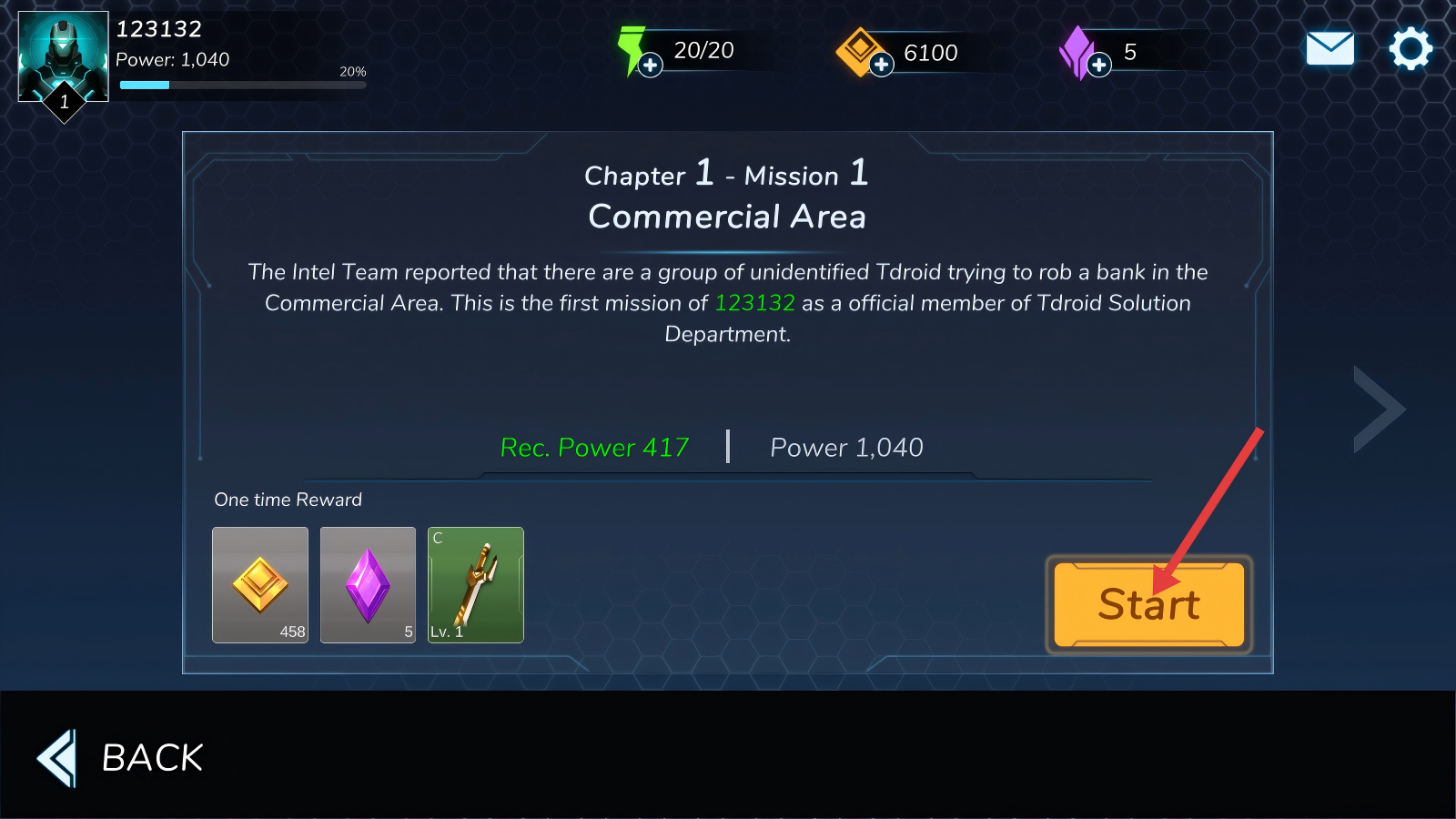 1、点击【Start】按钮开启【Chapter-1-Mission-1-Commercial-Area】任务,当前战力1040满足推荐战力417,可获取金币、紫晶和武器奖励。