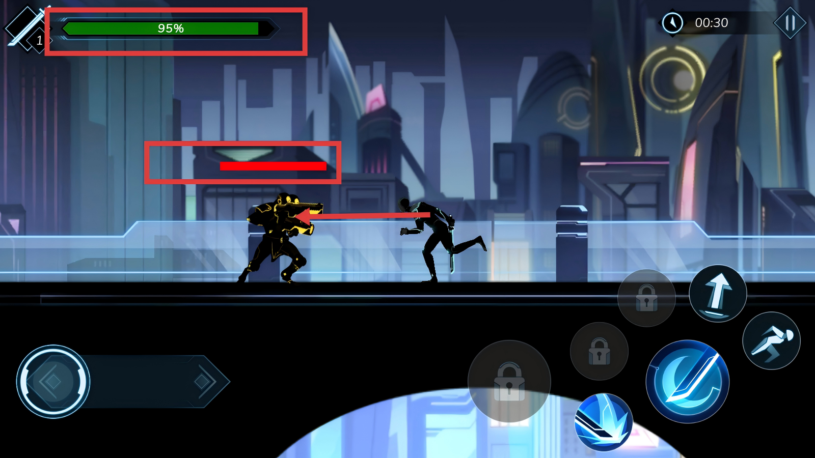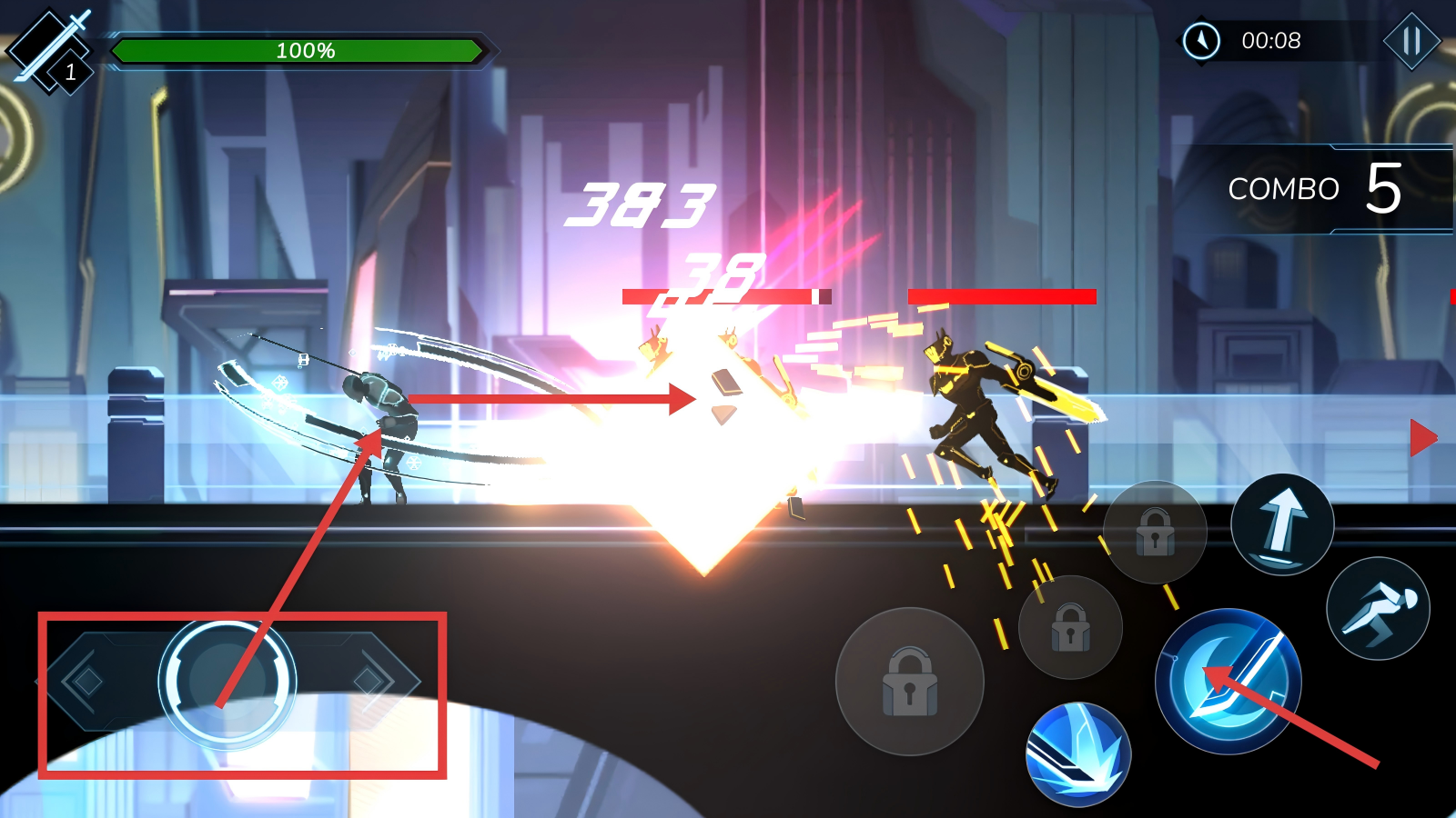 2、战斗时,操控左侧轮盘移动角色,点击右侧剑形技能按钮释放攻击,连招Combo数越高,伤害输出越可观。