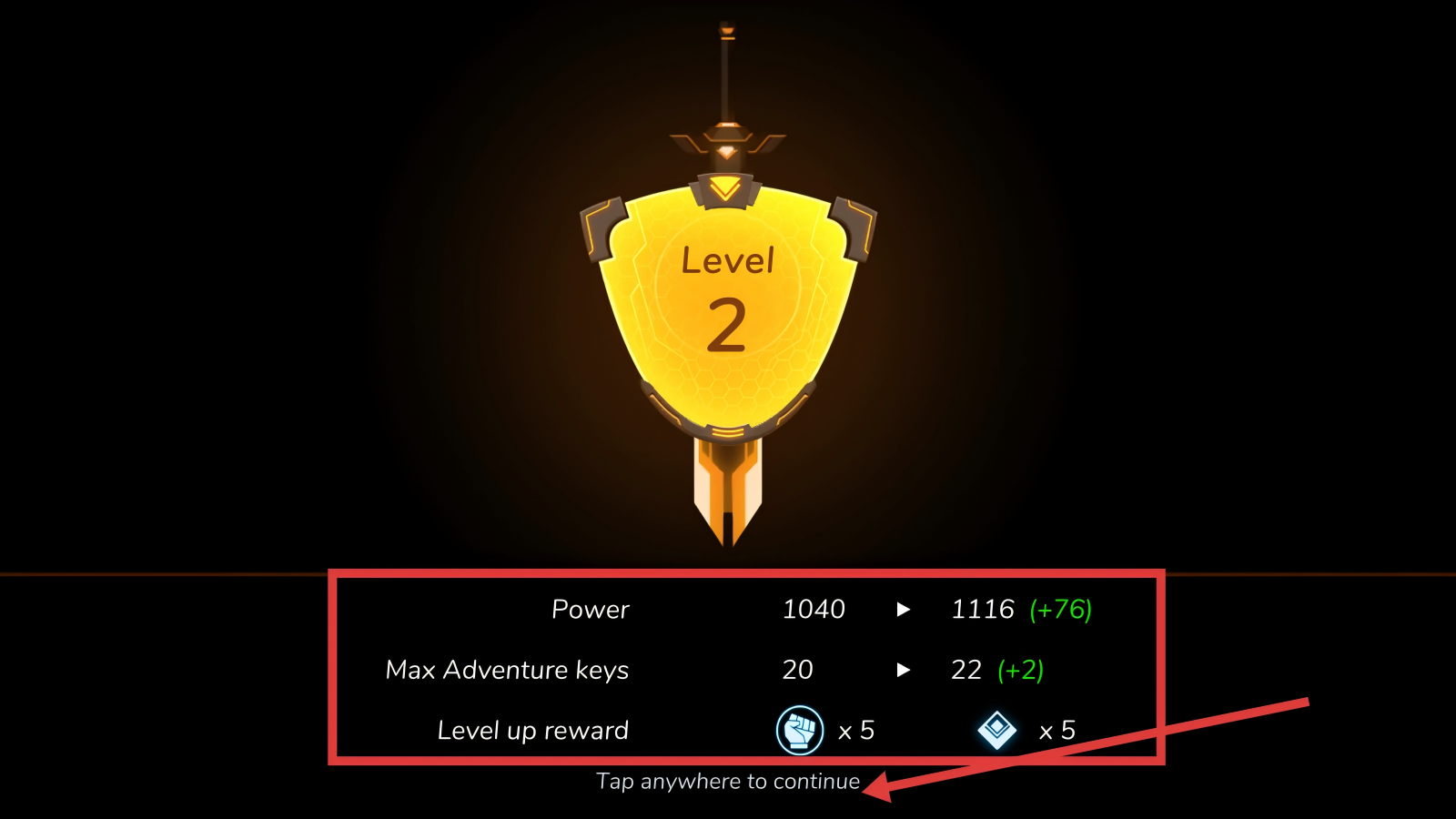 4、完成任务后会升级至Level2,战力提升至1116,还能获得【Max-Adventure-keys】增加及等级奖励,点击屏幕可继续游戏。