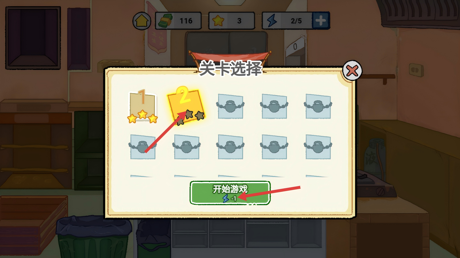 1、在关卡选择界面,点击亮黄色的【2】号关卡,再点击绿色【开始游戏】按钮,消耗1个道具即可进入关卡。