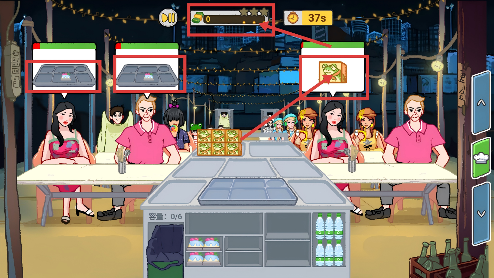 2、进入关卡后,观察顾客头顶的餐品需求图标,如带青蛙图案的食物、有蛋糕的餐盘等,快速从下方备餐区选取对应餐品提供给顾客。