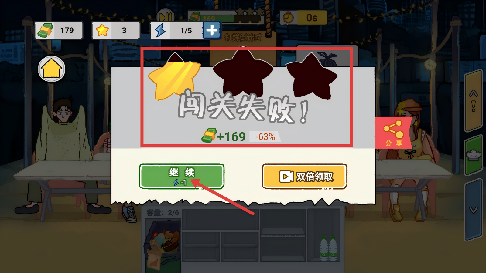 4、若出现【闯关失败】提示,可点击绿色【继续】按钮(消耗1个道具)重新挑战关卡,也可选择【双倍领取】看广告获得更多金币。