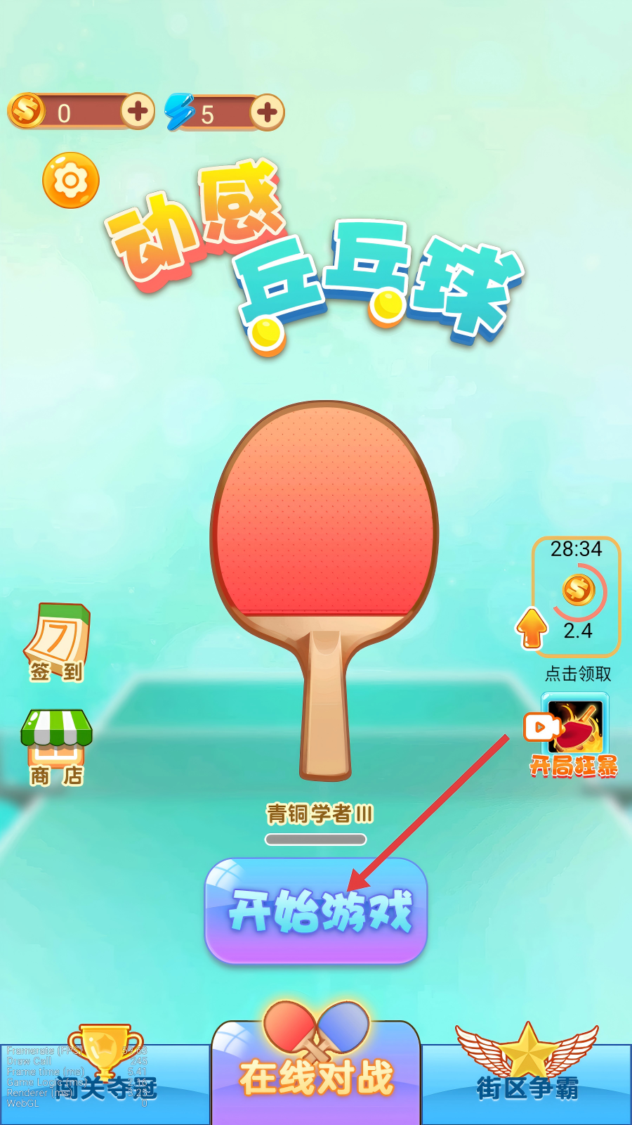 1、点击【开始游戏】,进入《动感乒乓球》对战,初始段位为【青铜学者III】,准备开启乒乓球对决。