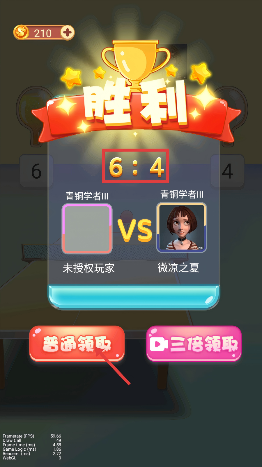 4、以6:4等比分获胜后,点击【普通领取】获取金币奖励,积累资源提升对战实力。