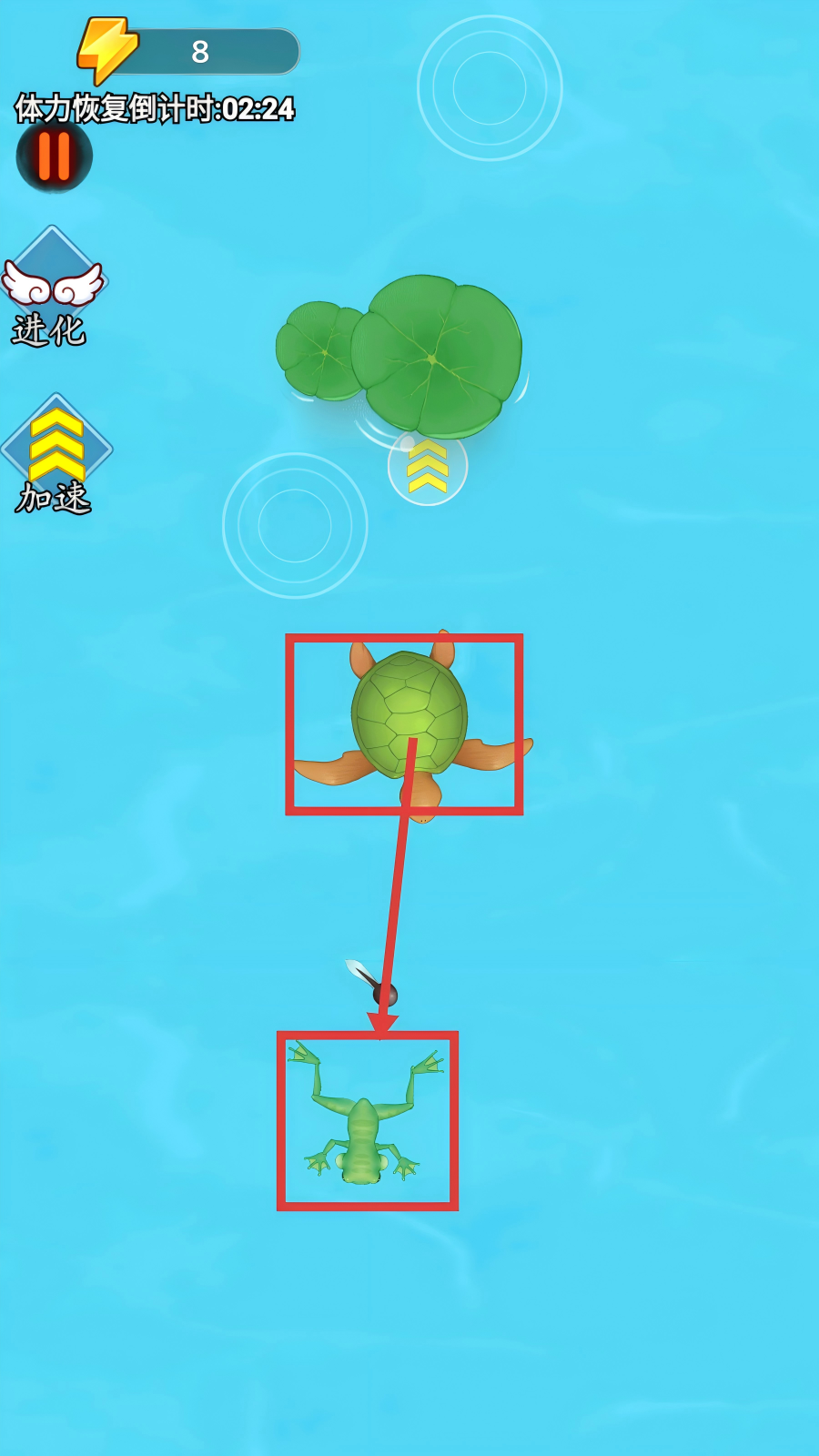 2、在水域场景中,操控乌龟等初始生物,优先吞噬青蛙等更小的生物,积累进化基础。
