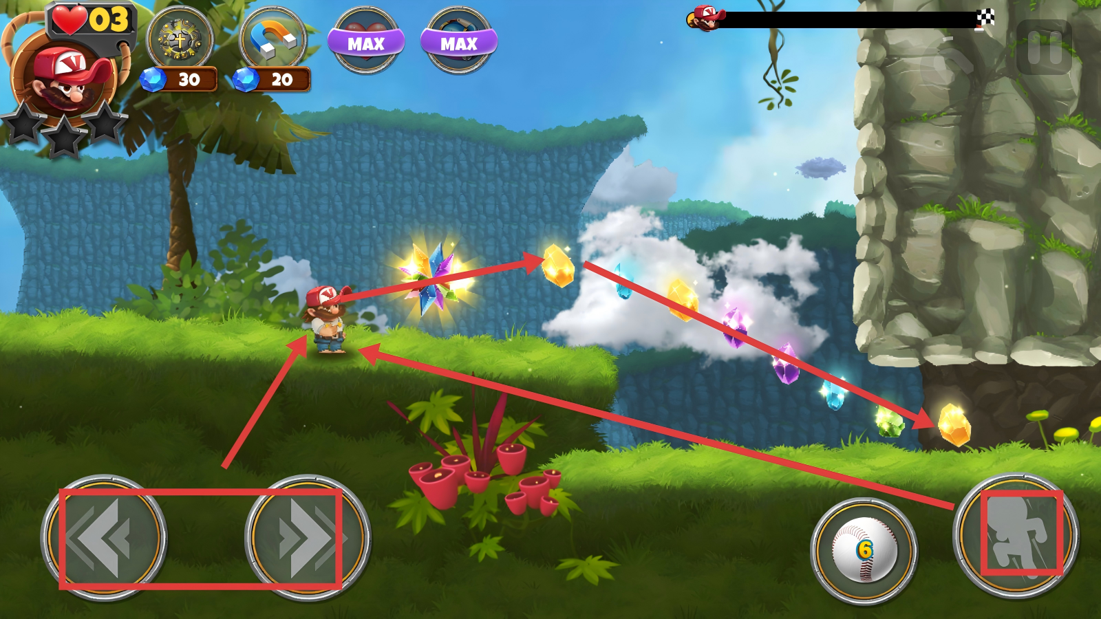 2、在关卡中,用左侧方向键控制角色移动,按右侧跳跃键,收集沿途各色宝石,积累道具。