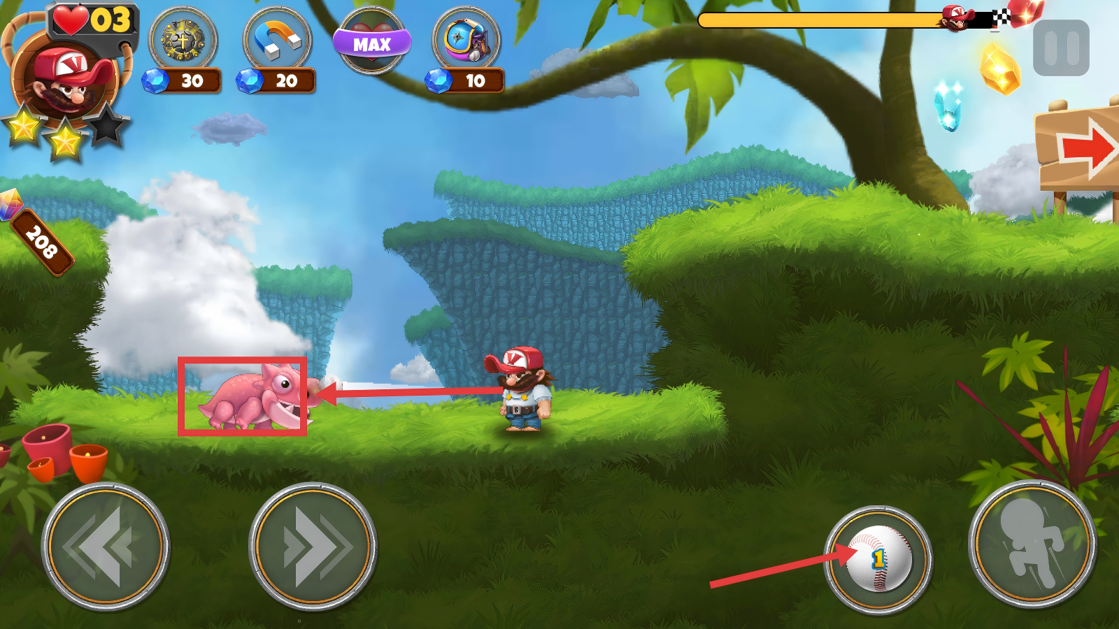 3、遇到【粉色恐龙】敌人时,点击右侧棒球道具按钮,向敌人发射棒球,进行攻击推进关卡。