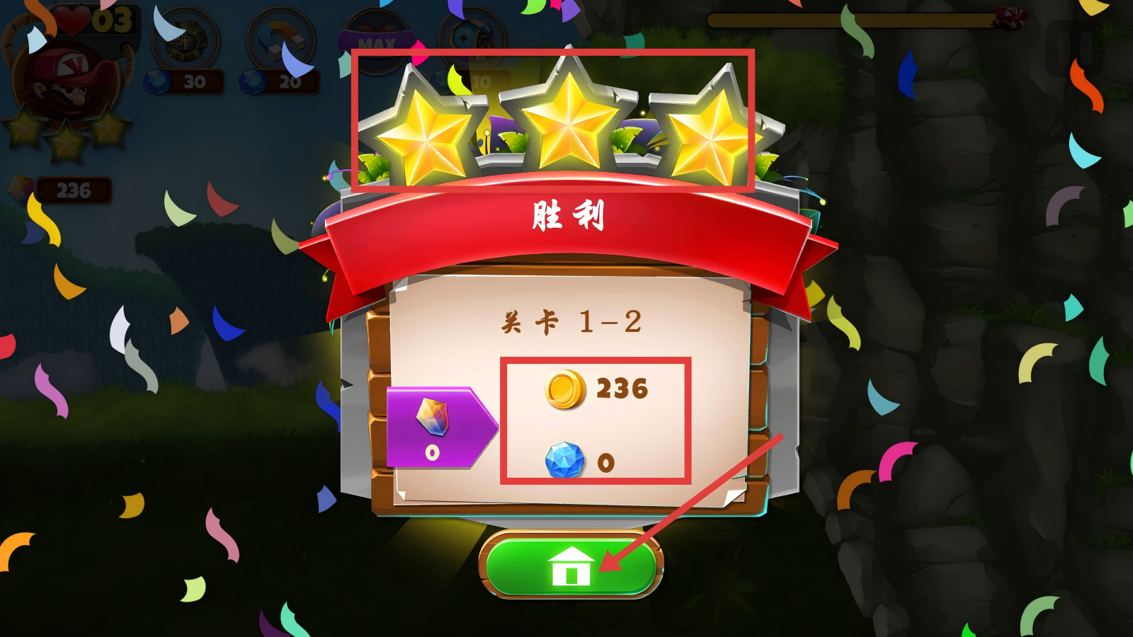 4、通关【关卡1-2】后,会显示胜利结算,获得星星与金币,可点击绿色主页按钮返回关卡选择界面。