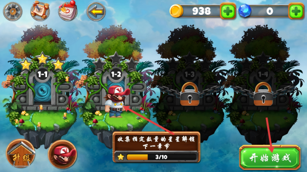 1、选择【1-2】关卡,点击【开始游戏】按钮,进入关卡冒险,还需收集星星解锁后续章节。