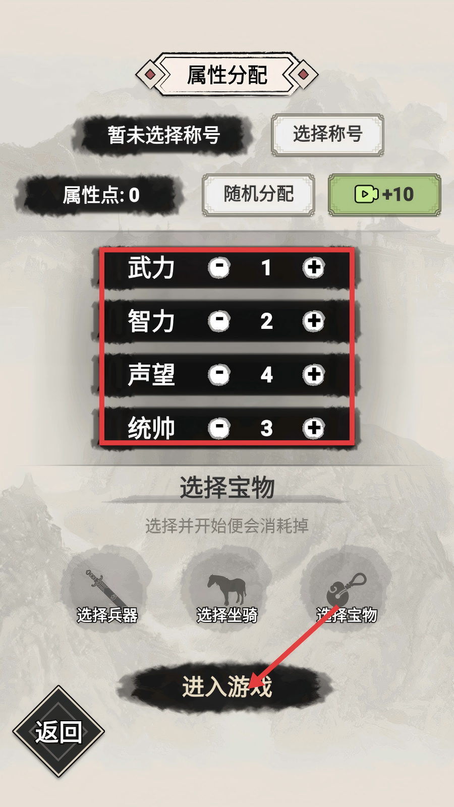 1、在属性分配界面,查看【武力】【智力】【声望】【统帅】数值,属性点不足可看视频+10,再点【进入游戏】开启人生。