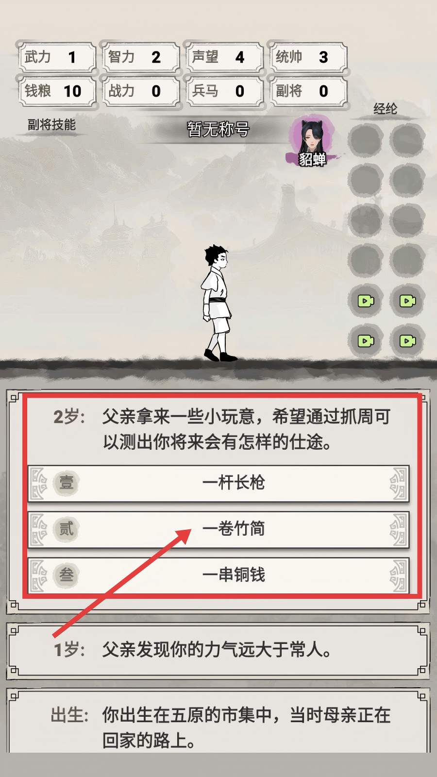 2、2岁触发抓周事件,有【一杆长枪】【一卷竹简】【一串铜钱】可选,可根据想发展的方向来选择道具。