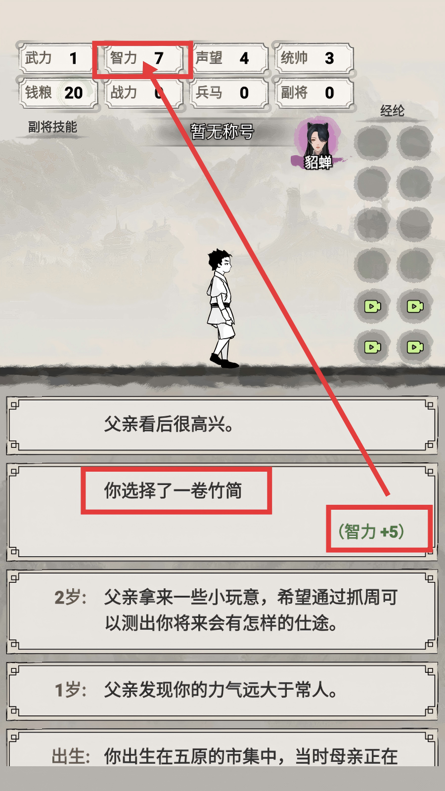 3、选择【一卷竹简】后,能获得【智力+5】的加成,提升智力属性,且父亲会因这个选择而感到高兴。