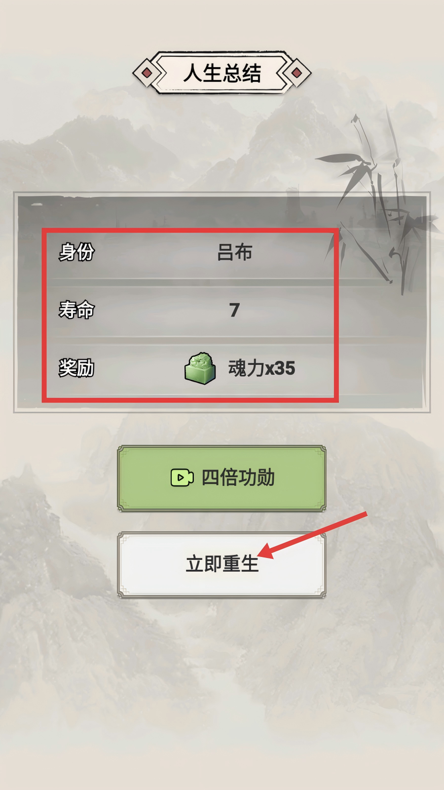 4、人生结束后会显示【人生总结】,包含身份、寿命、奖励(如魂力x35),想重新开始就点击【立即重生】。