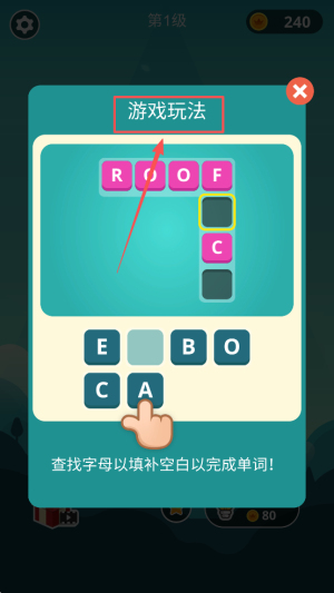 1、开启猜字挑战:进入游戏熟悉规则,明确 “从底部卡片选字母、填充缺失位置完成单词” 目标,解锁初始关卡。