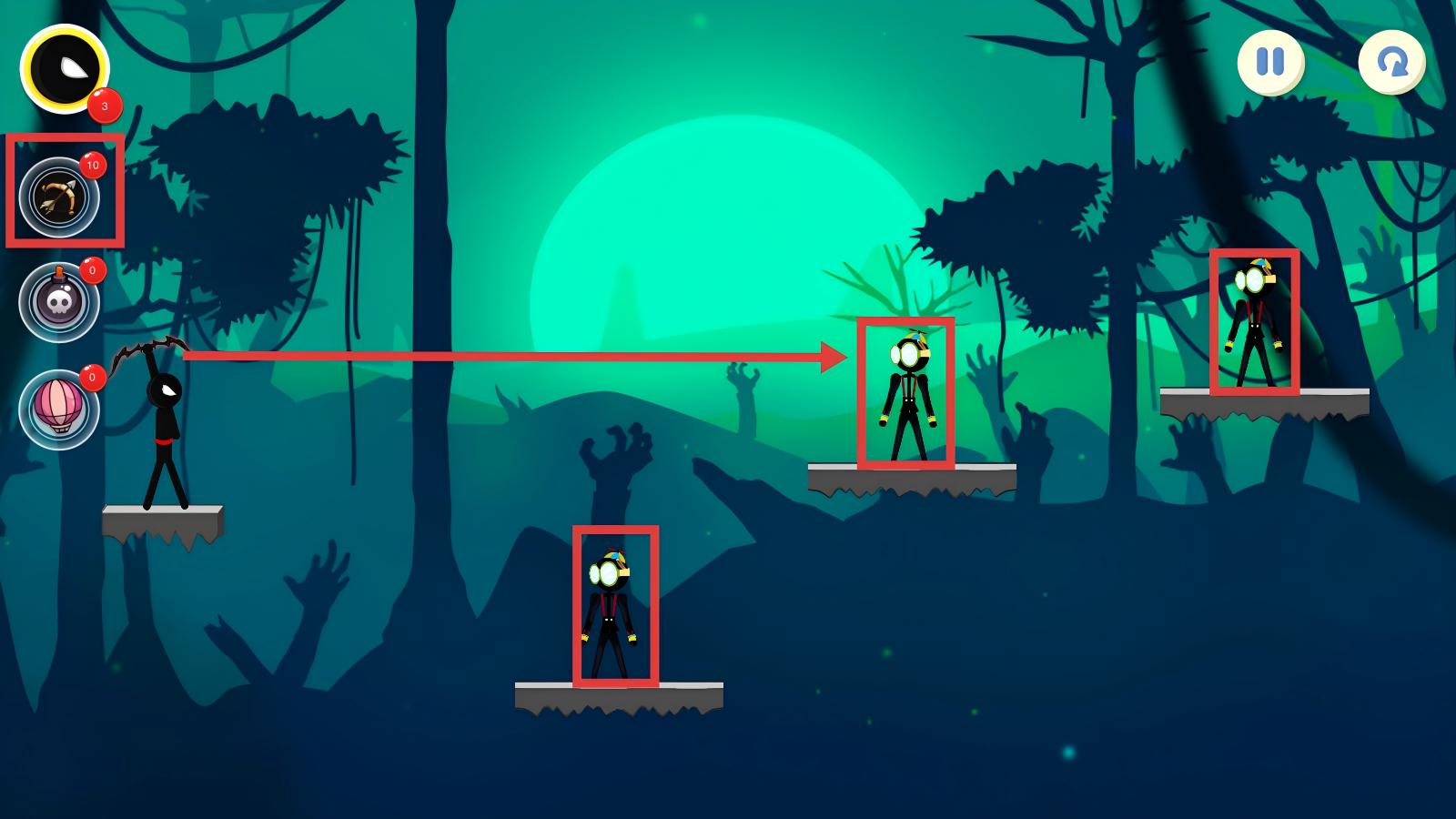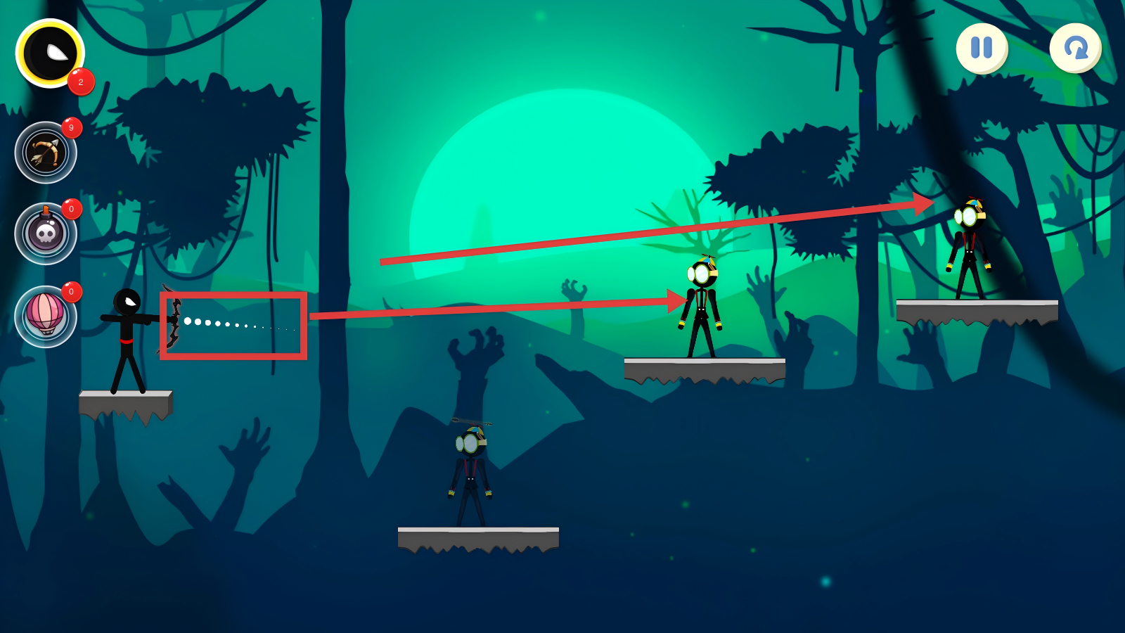 2、在关卡里,先观察敌人的位置分布,左侧带有数字标识的道具可辅助攻击,清晰明确目标后准备射击。