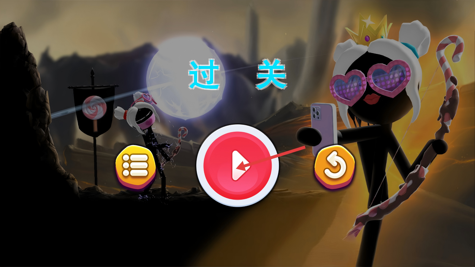 4、成功击败所有敌人后,会出现【过关】界面,点击中间的红色箭头按钮可继续挑战下一关,也可选择其他功能按钮进行操作。