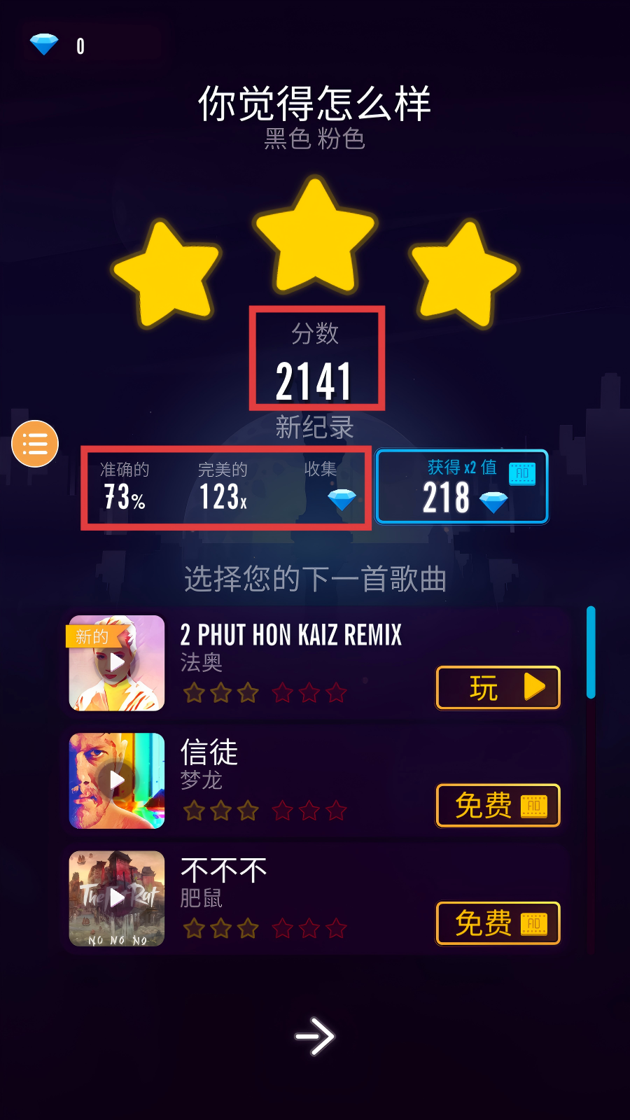 4、通关后会显示分数、准确率等数据,若想挑战更高纪录,可选择下一首歌曲,如【2PHUTHONKAIZREMIX】继续游玩。