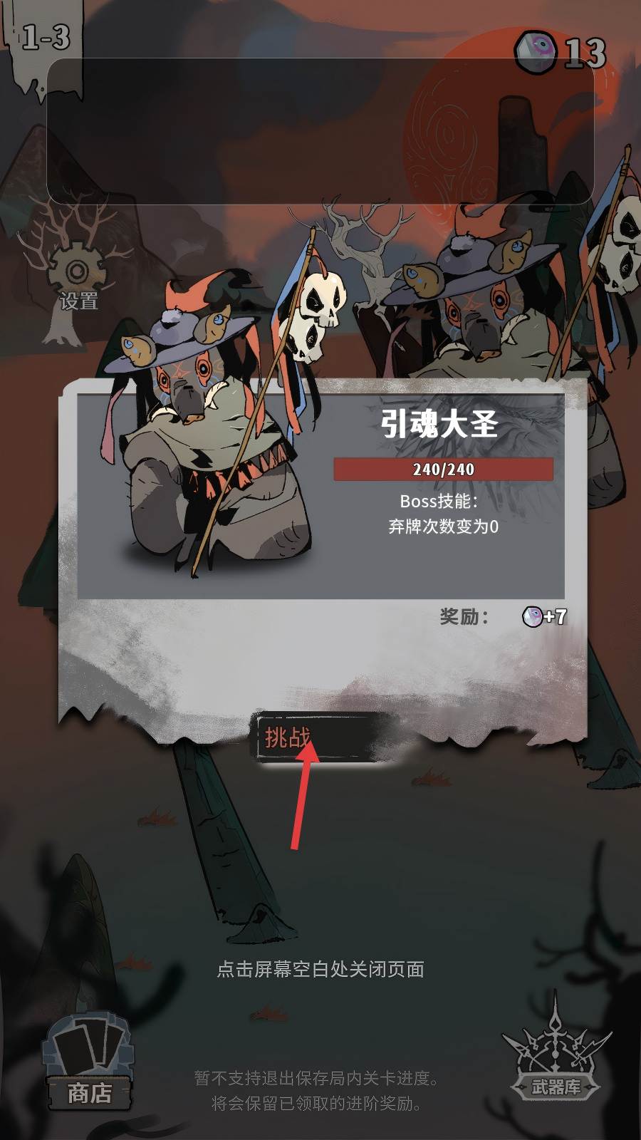 1、挑战【引魂大圣】前,留意其BOSS技能【弃牌次数变为0】,确认后点击【挑战】按钮开启战斗。