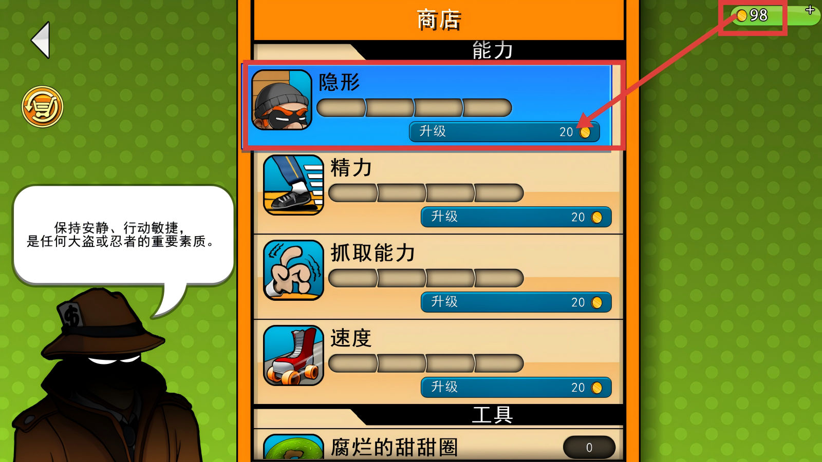 2、在商店中,优先用金币升级【隐形】能力,花费20金币提升后,能更隐蔽地进行盗窃,降低被发现的风险。