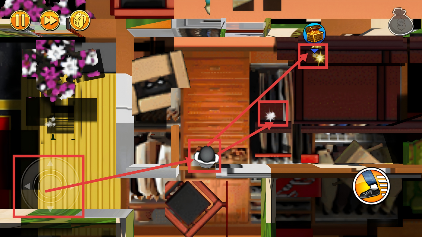 3、关卡内,通过左侧虚拟摇杆控制鲍勃移动,优先收集闪光的金币和宝箱,避开视线,高效完成盗窃目标。