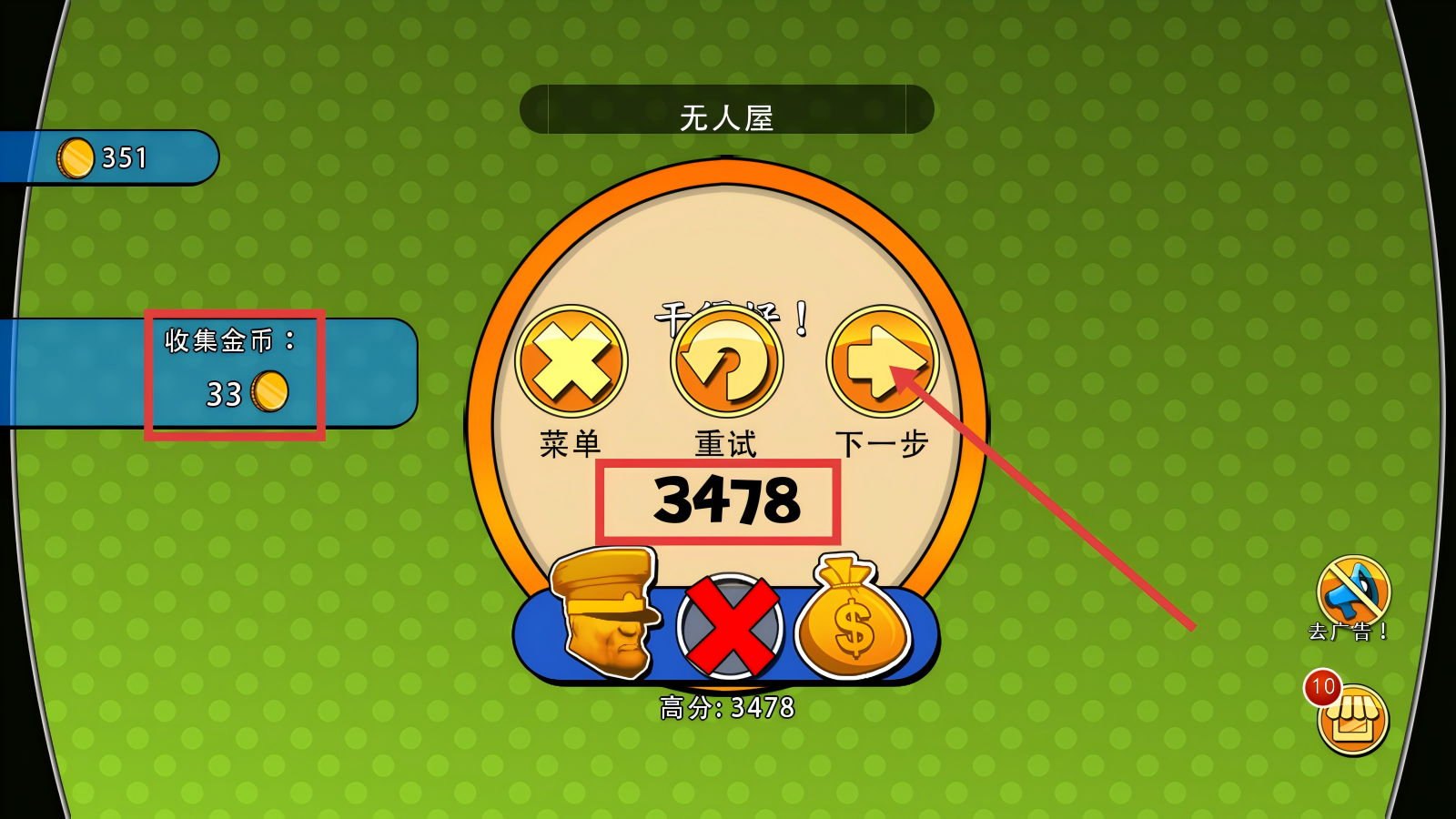 4、完成“无人屋”等关卡后,查看收集的金币数量与得分,点击【下一步】按钮,继续挑战更多盗窃关卡。