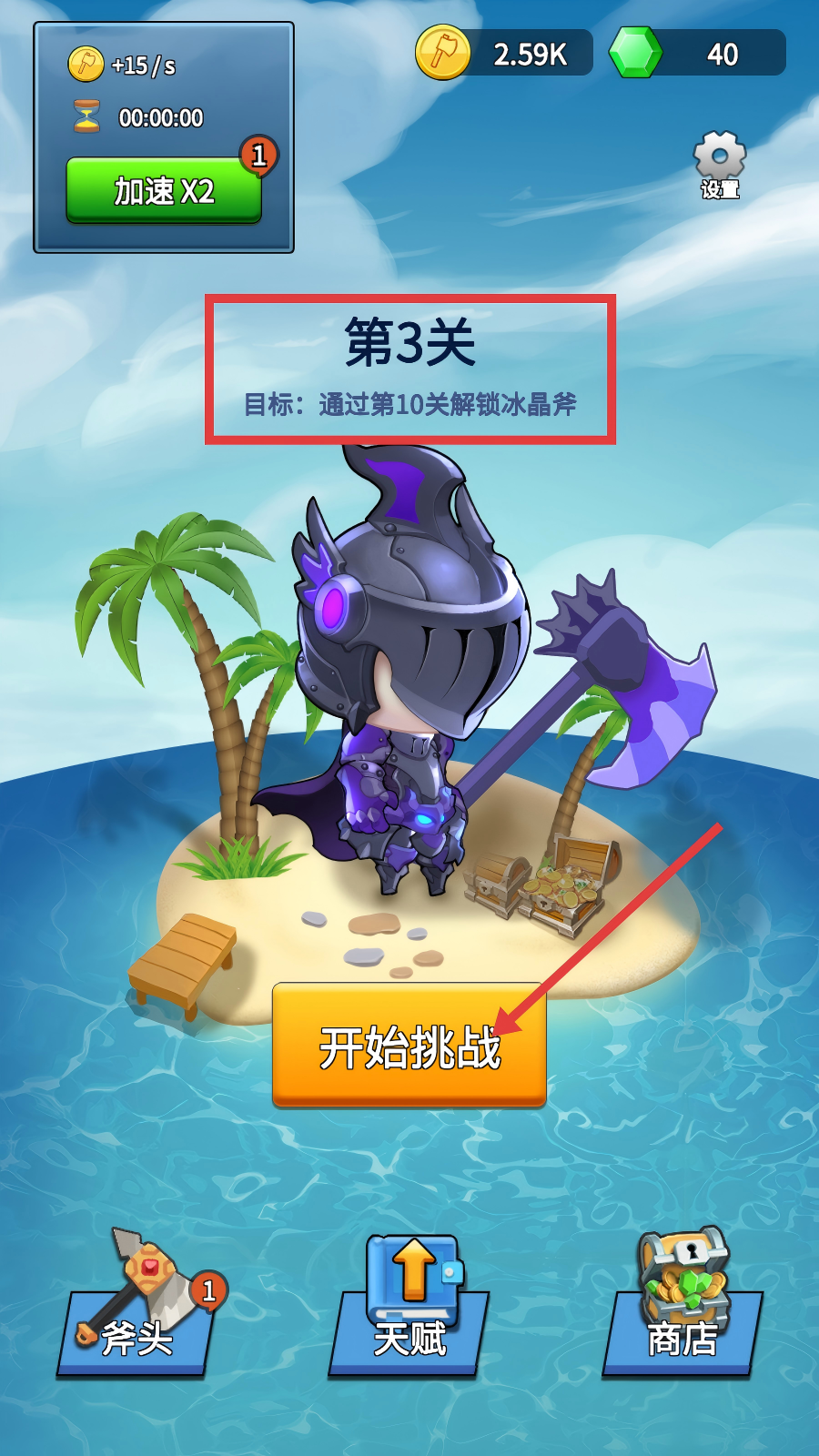 1、进入第3关后,明确目标【通过第10关解锁冰晶斧】,点击【开始挑战】按钮,开启本关战斗。