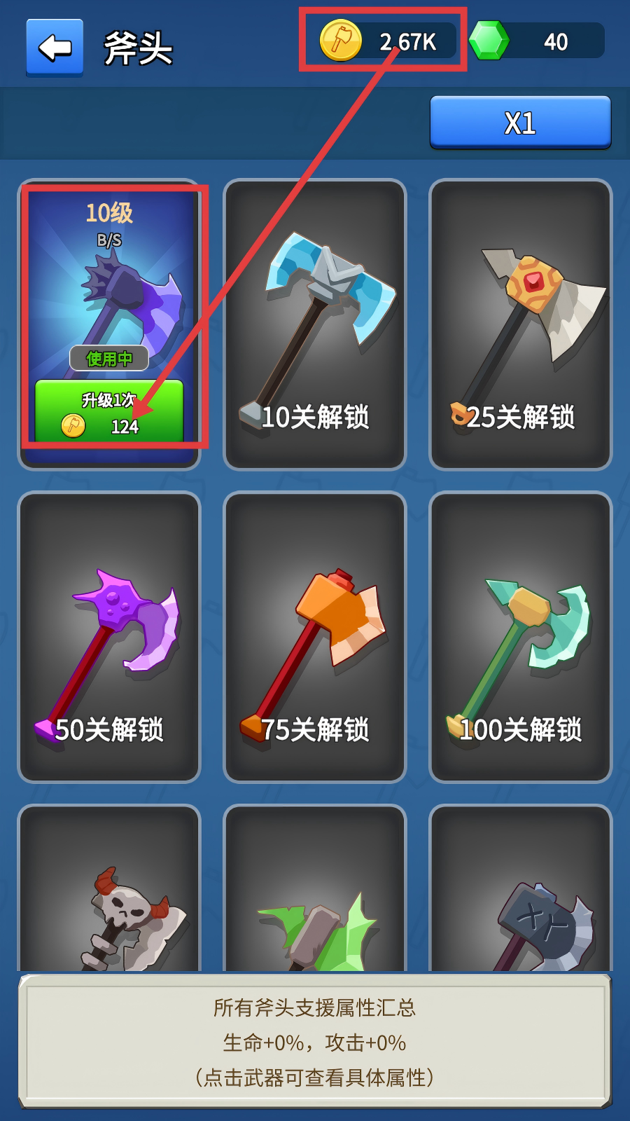 2、在斧头界面,消耗金币升级当前【使用中】的斧头,提升斧头战力,为战斗提供更强输出。