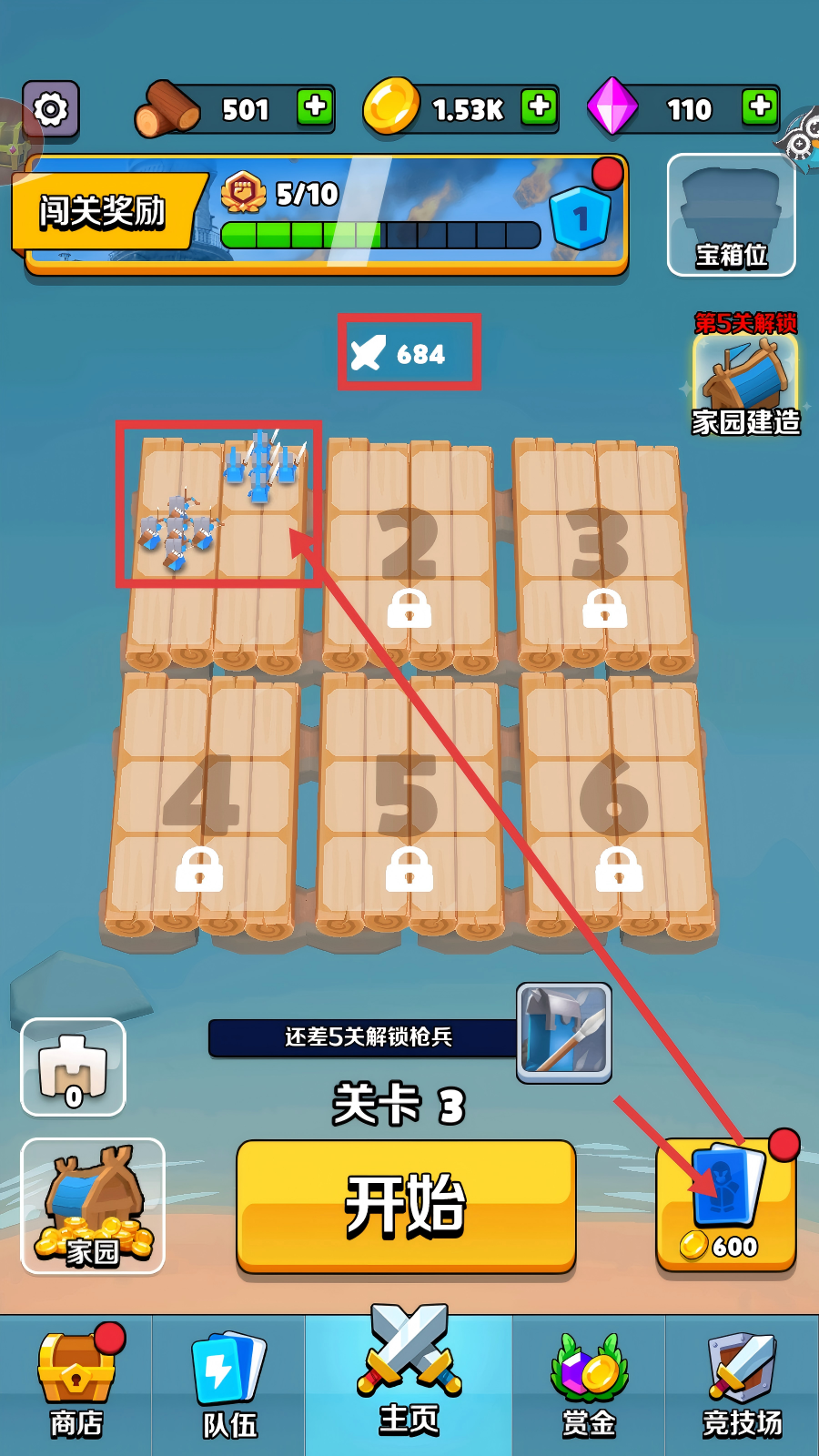 1、在关卡选择界面,确认当前为【关卡3】,点击黄色【开始】按钮前,可消耗600金币获取增益,提升战斗准备。