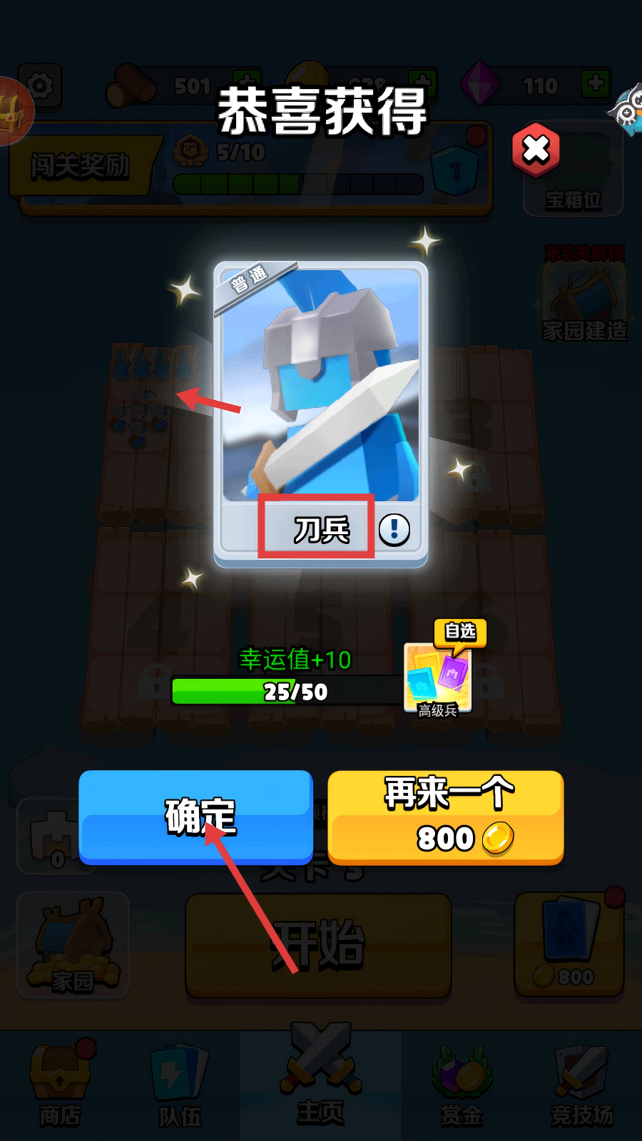 2、获得【刀兵】卡牌时,点击【确定】按钮领取,该普通兵种可用于组建战斗队伍,助力关卡挑战。