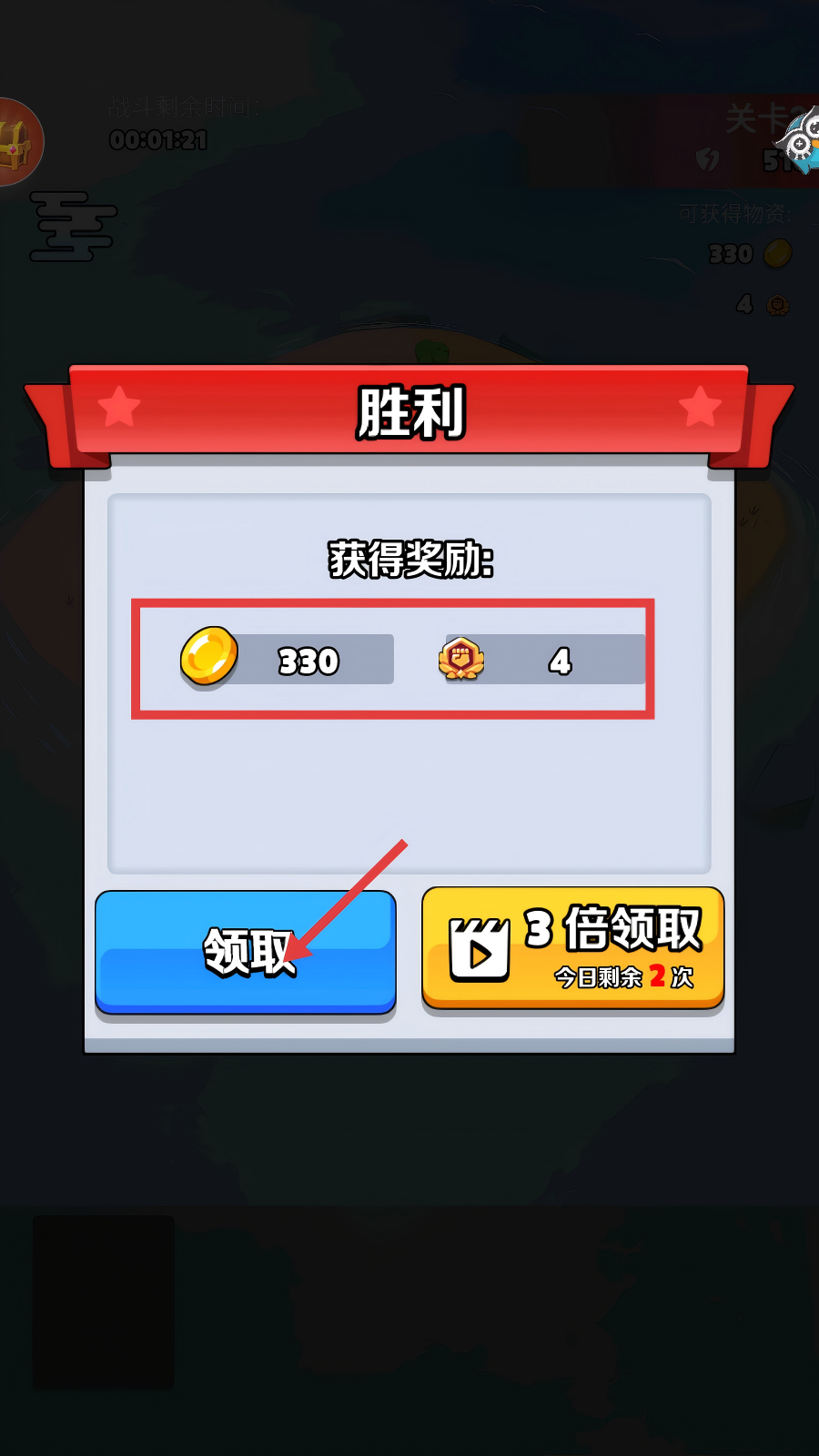 4、战斗胜利后,在【胜利】界面点击【领取】按钮,获取330金币和4徽章奖励,积累资源用于后续养成。