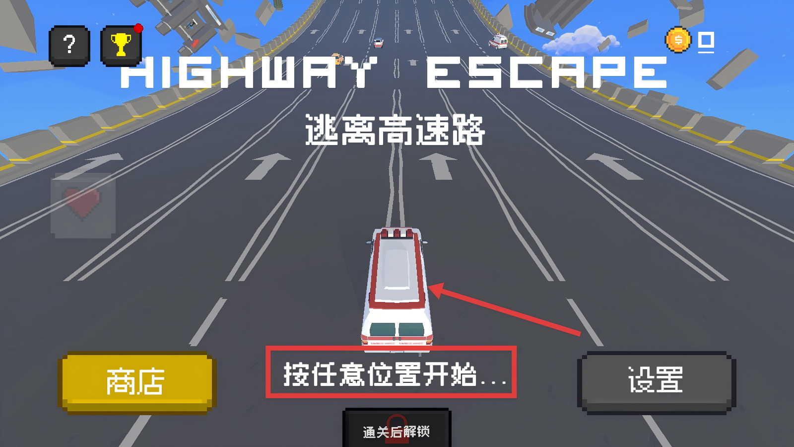 1、进入【HIGHWAY-ESCAPE】游戏,按任意位置即可开始,准备在高速路中展开逃亡。