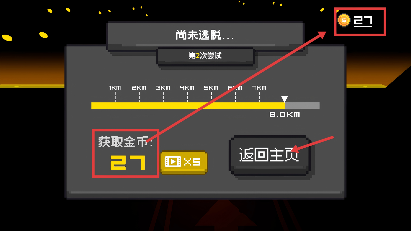 4、若挑战结束,可查看获取的金币数量,也能点击【返回主页】重新开始或进入其他界面。