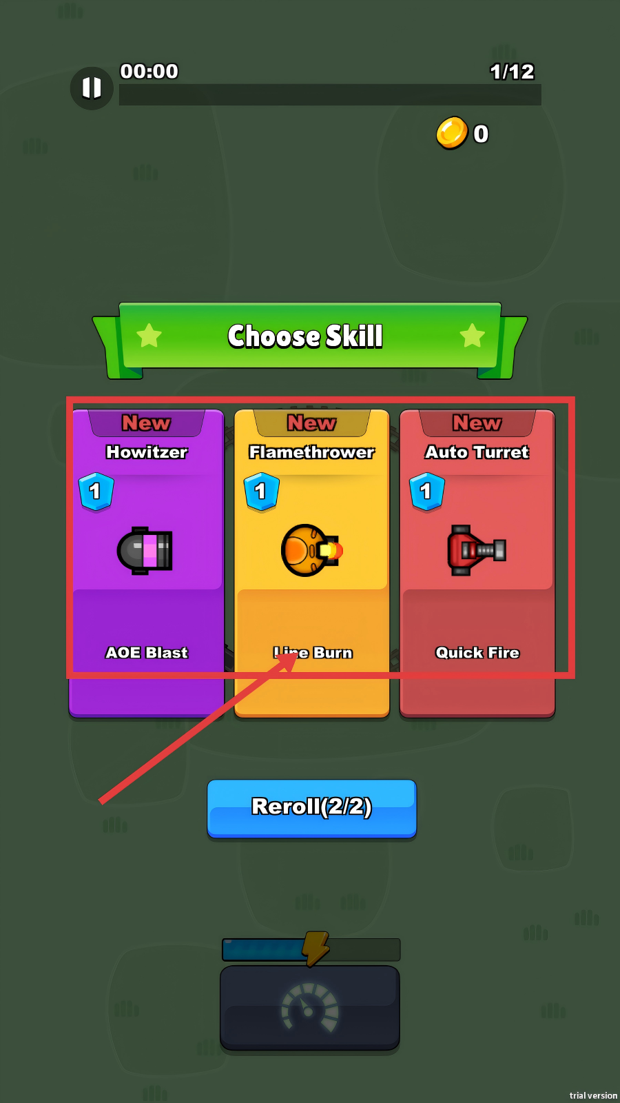 2、冒险过程中会出现【Choose-Skill】界面,可从【Howitzer】【Flamethrower】【Auto-Turret】中选择技能,增强火车能力。