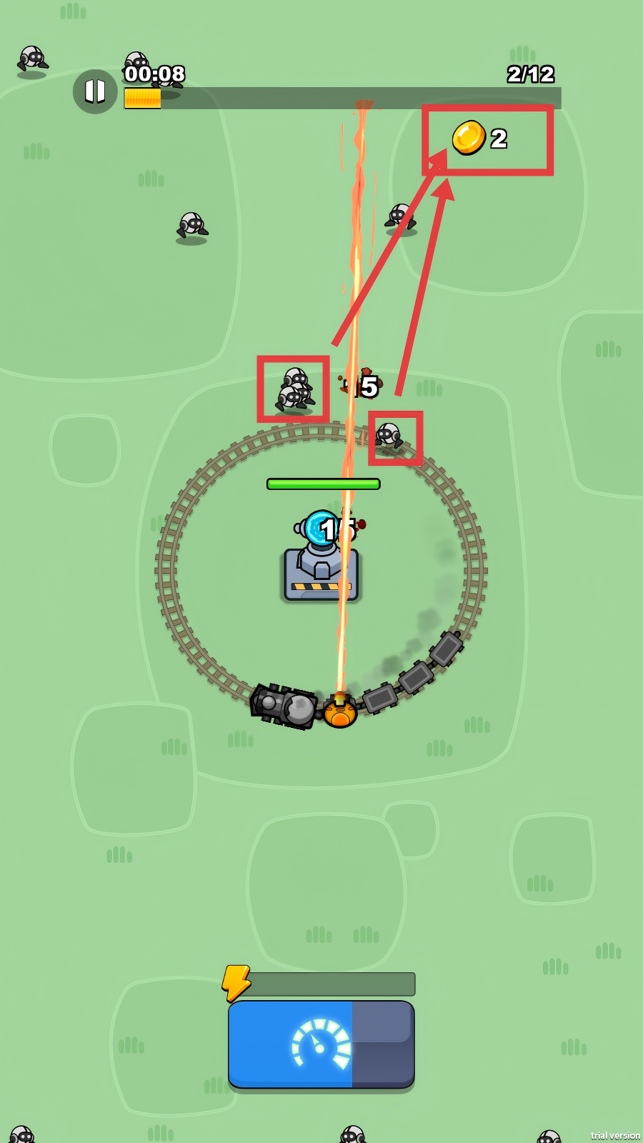 3、战斗时,操控火车攻击周围敌人,同时要收集金币,像界面中显示的【金币-2】那样,积累资源用于后续强化。