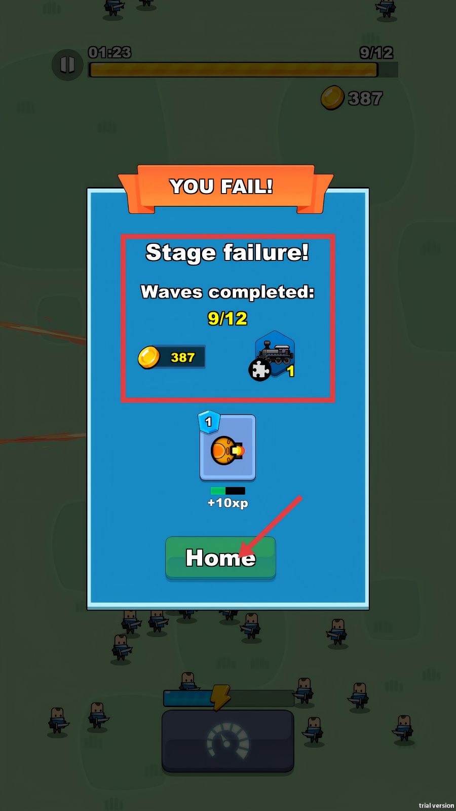 4、若挑战失败,会出现【YOU-FAIL!】界面,显示完成的波数【9/12】和获得的金币,点击【Home】按钮可返回主页,为再次挑战做准备。