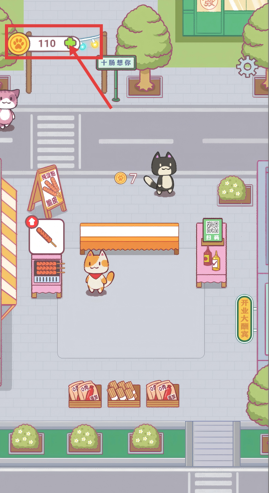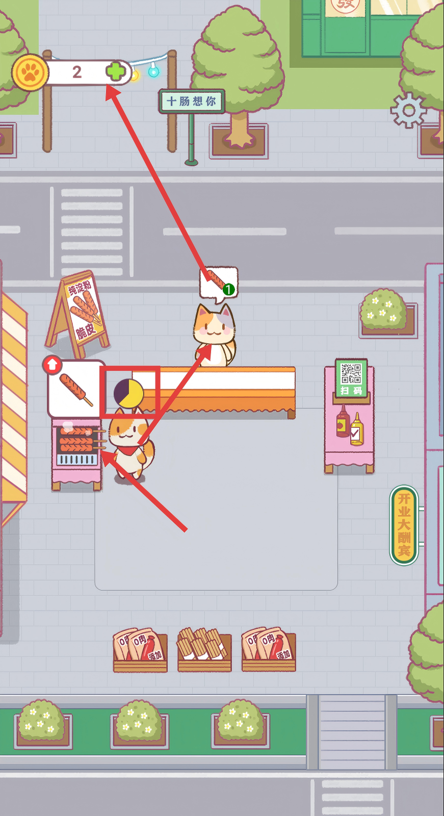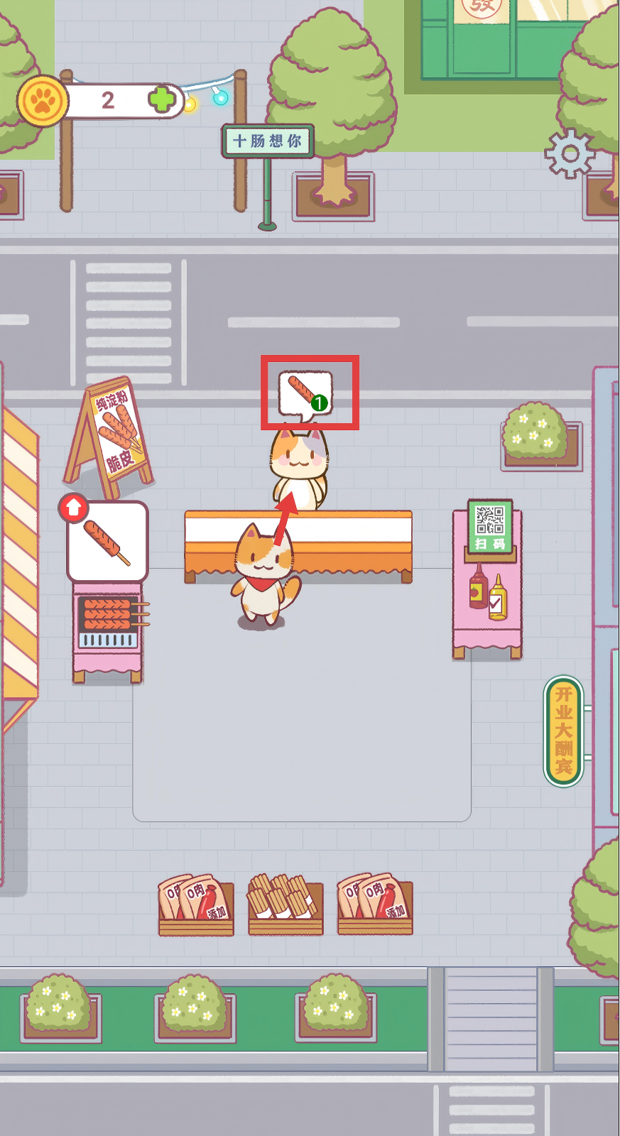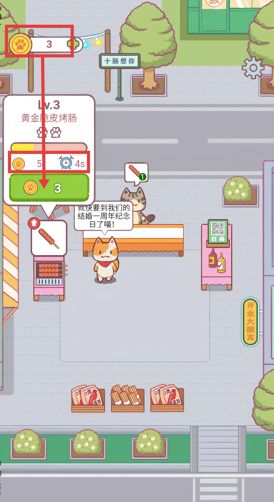 4、持续为顾客提供烤肠,积累左上角的数值,不断推进烤肠摊的经营进程。