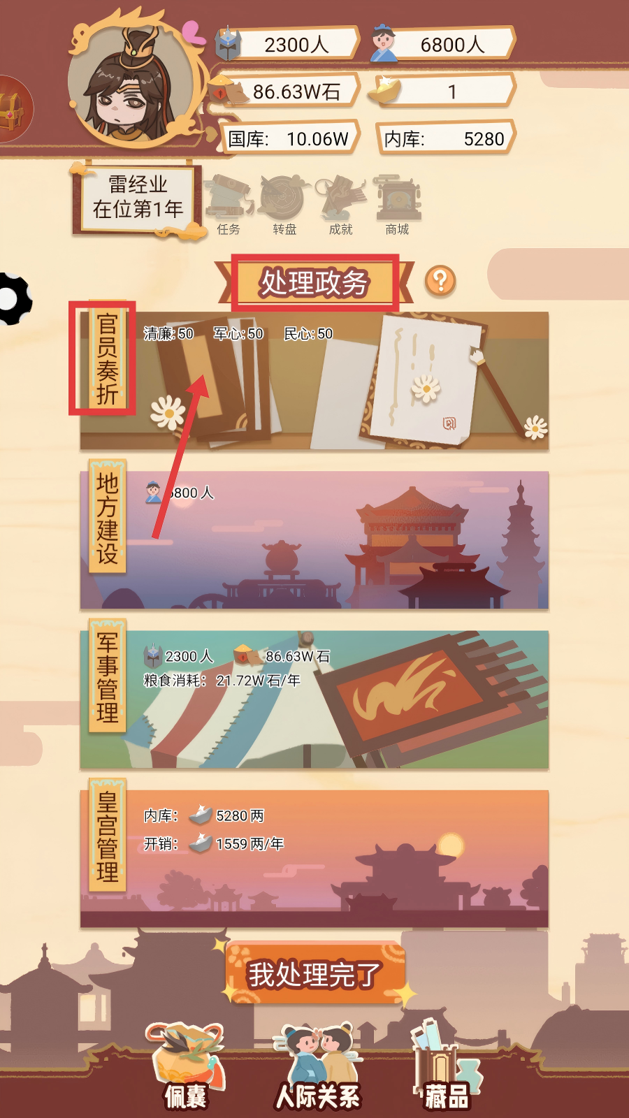 2、进入主界面后,在“处理政务”板块,优先点击【官员奏折】,查看待决策的事务。