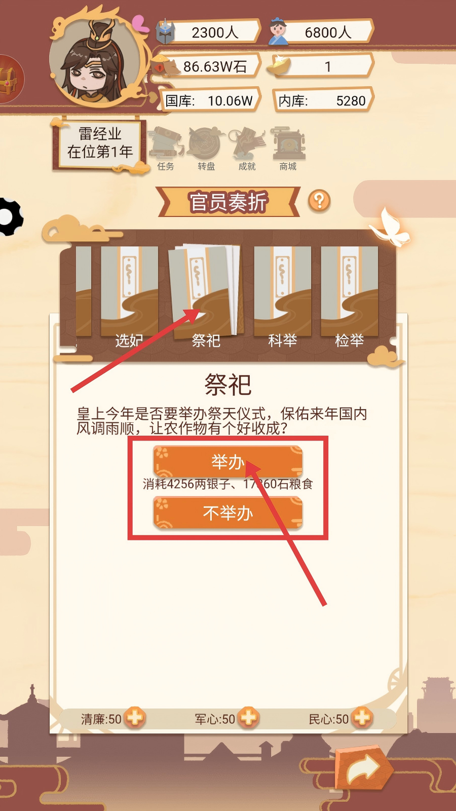 3、遇到“祭祀”类奏折时,可选择【举办】,消耗4256两-银子、17360石-粮食来执行祭天仪式。