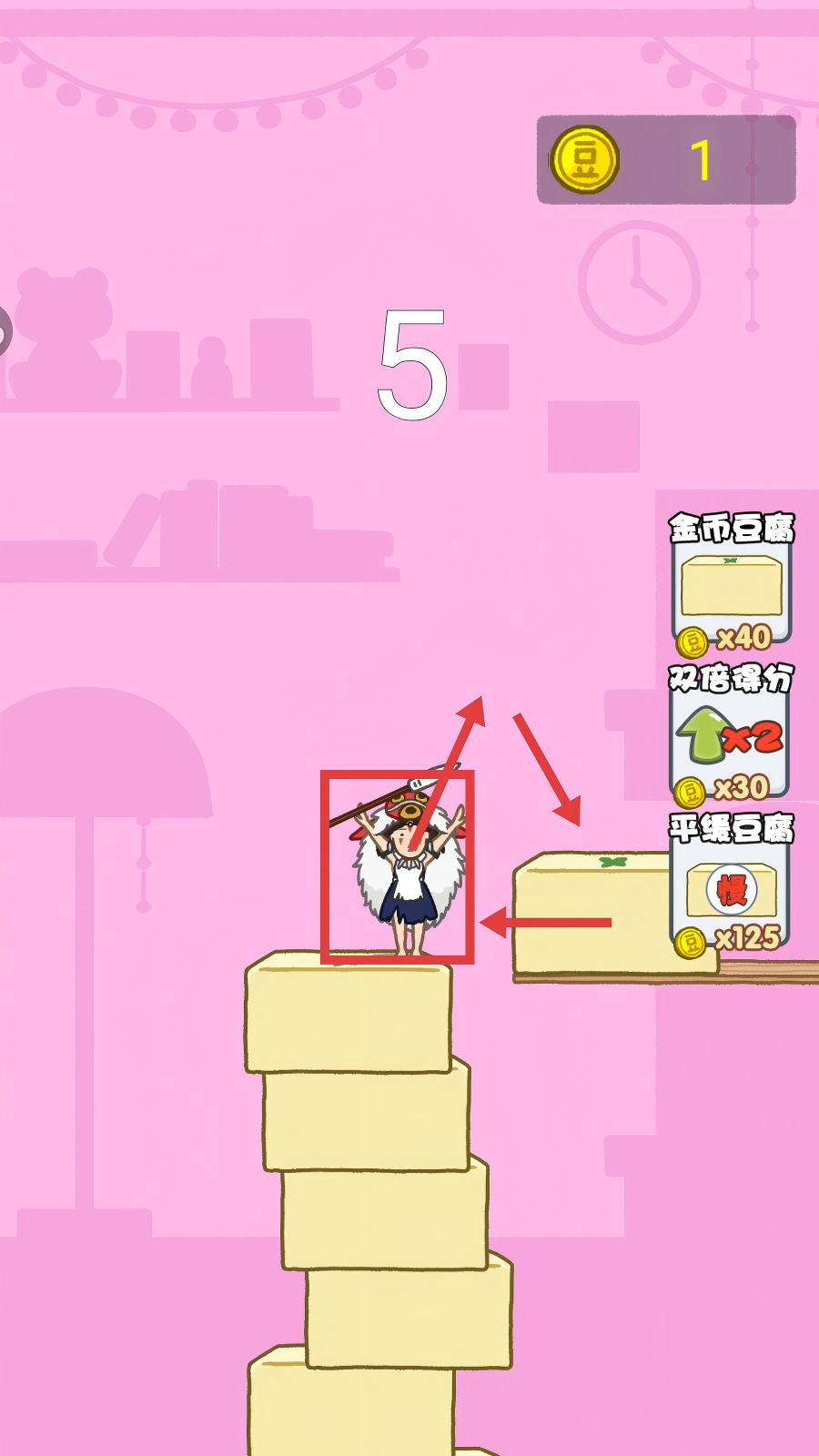 2、挑战中操控角色在豆腐上跳跃,精准跳到相邻豆腐上,过程中可获取金币,积累分数。
